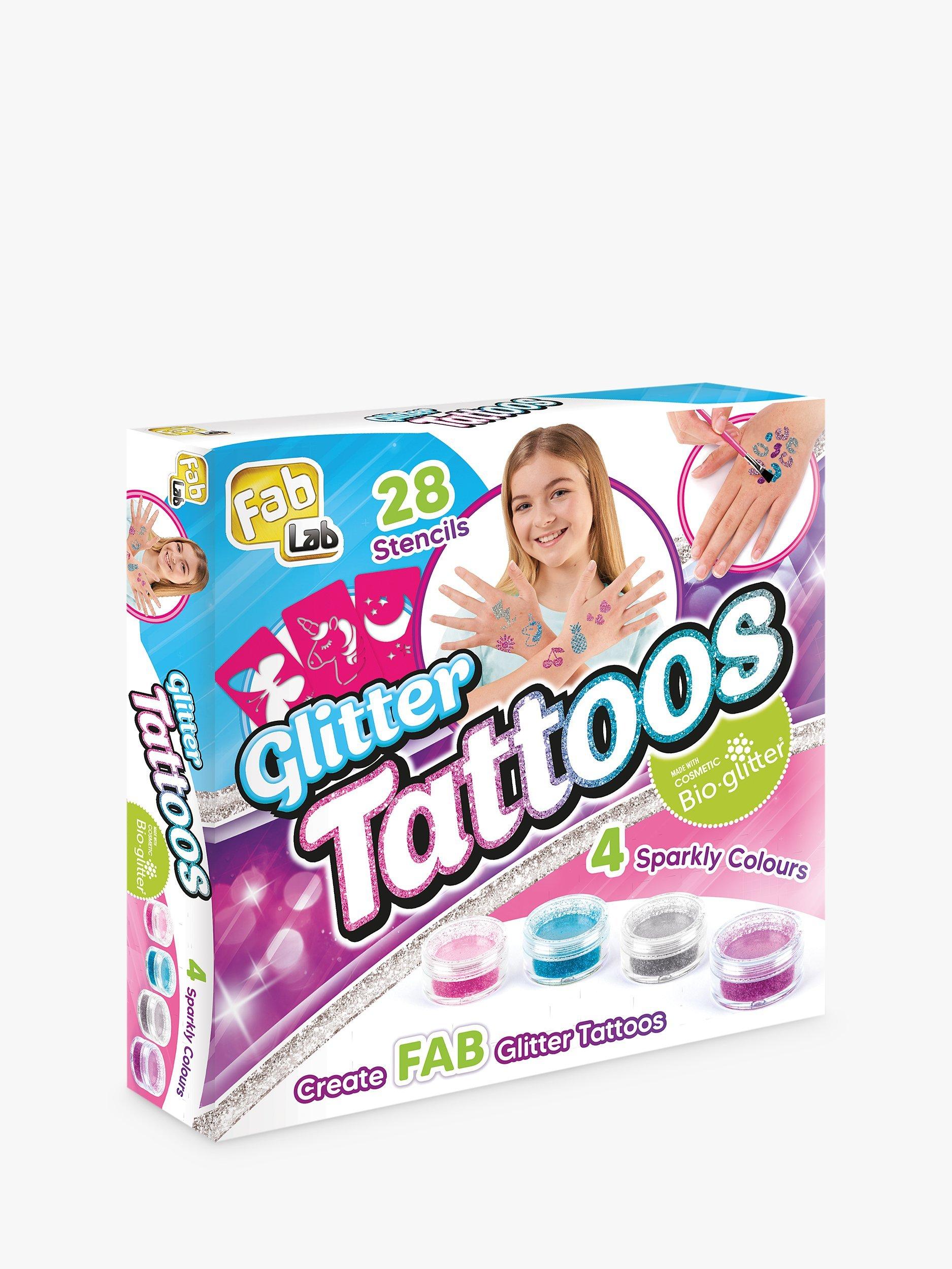 Join the glitter tattoo craze with this FabLab Glitter Tattoo kit! With over 28 unique eye-catching tattoo designs and 4 sparkly glitter colours to choose from you can create the ultimate glittery, shimmery, multi-coloured tattoos that can last up to 7 days!
