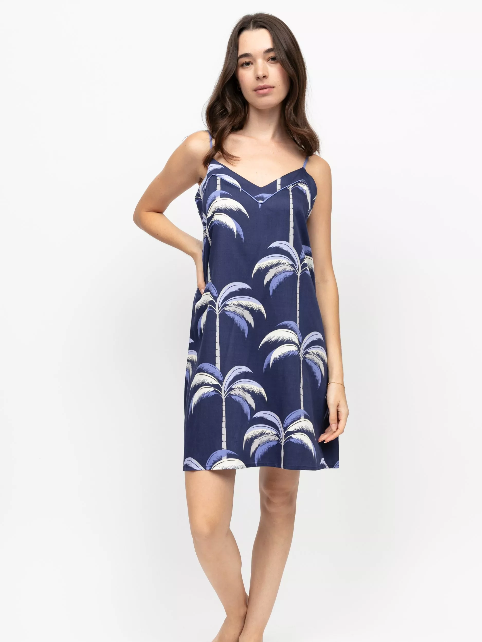 Make your evening unwind all the more indulgent in the Chancery nightdress. Brought to life in a scene of palm trees on a luxuriously-soft modal and cotton blend fabric. With a shaped front, straight-cut back, adjustable straps and coordinating piping throughout.