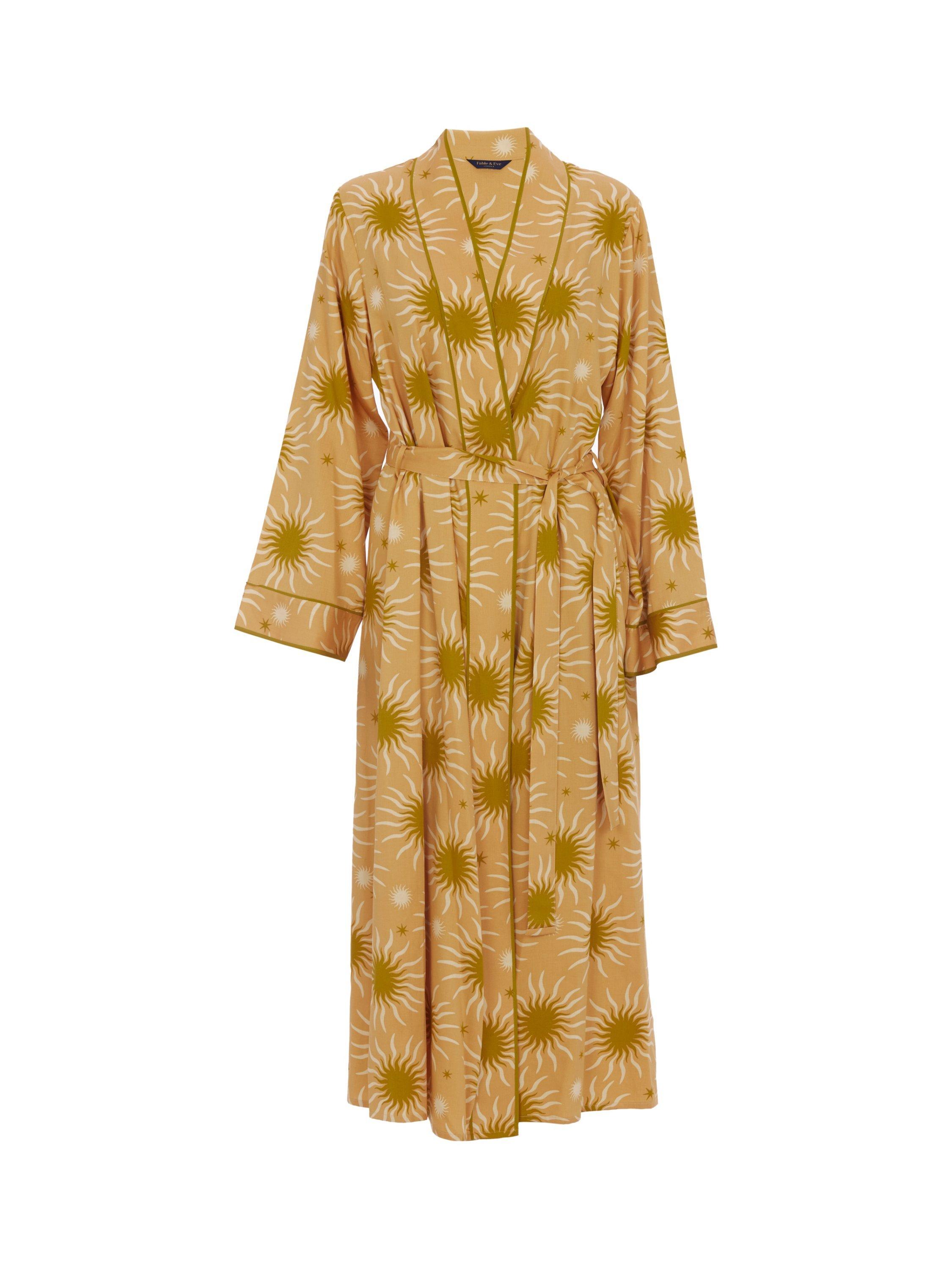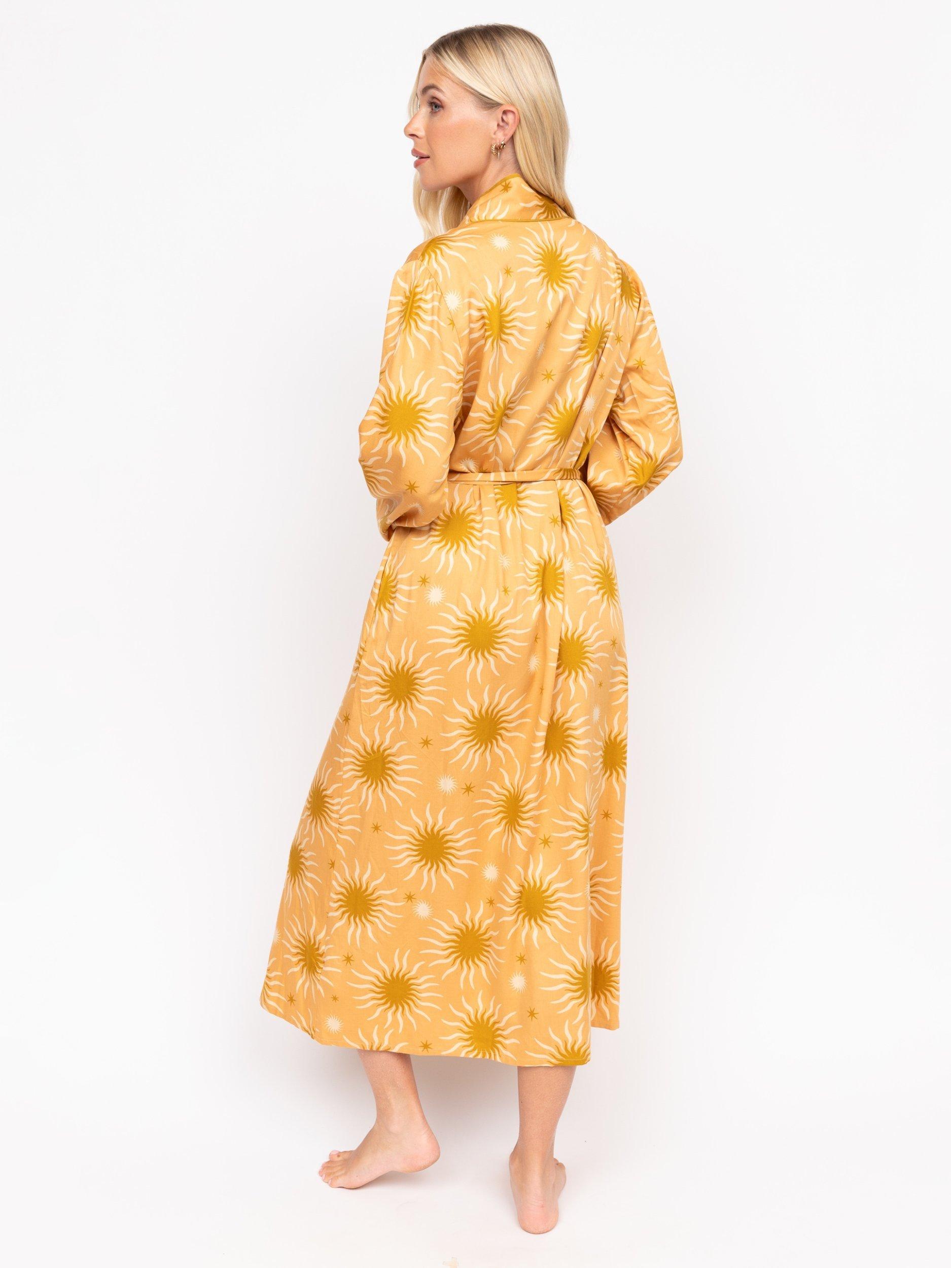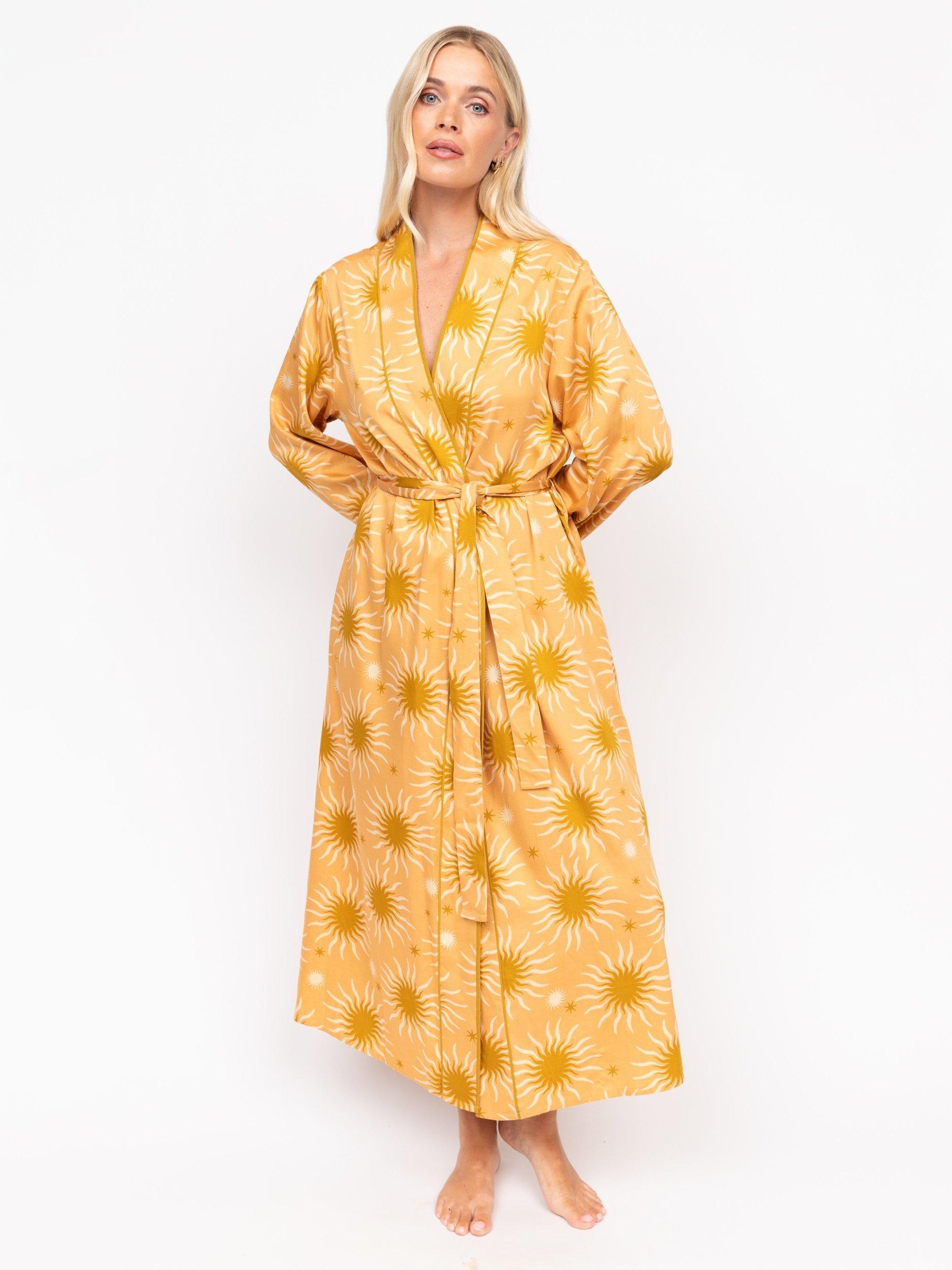Bring a ray of sunshine to your evening relaxation sessions with the Hoxton Sunshine Abstract Sun Print Long Sleeve Long Dressing Gown. With an abstract print of radiant suns against the background and a luxuriously soft fabric composition of 68% modal and 32% cotton, wrapping yourself in this dressing gown will instantly make your evening all the more chic and comfortable. Made in a kimono style, this gown has long cuffed sleeves, a wrap front, and a self fabric, folded bottom hem for a comfortable and flattering fit. Inner satin ties and a self fabric belt let you tighten this gown to your liking, and with the extra detail of a modal piping you can be sure you’re tying yourself up in luxurious comfort for an evening of bliss.