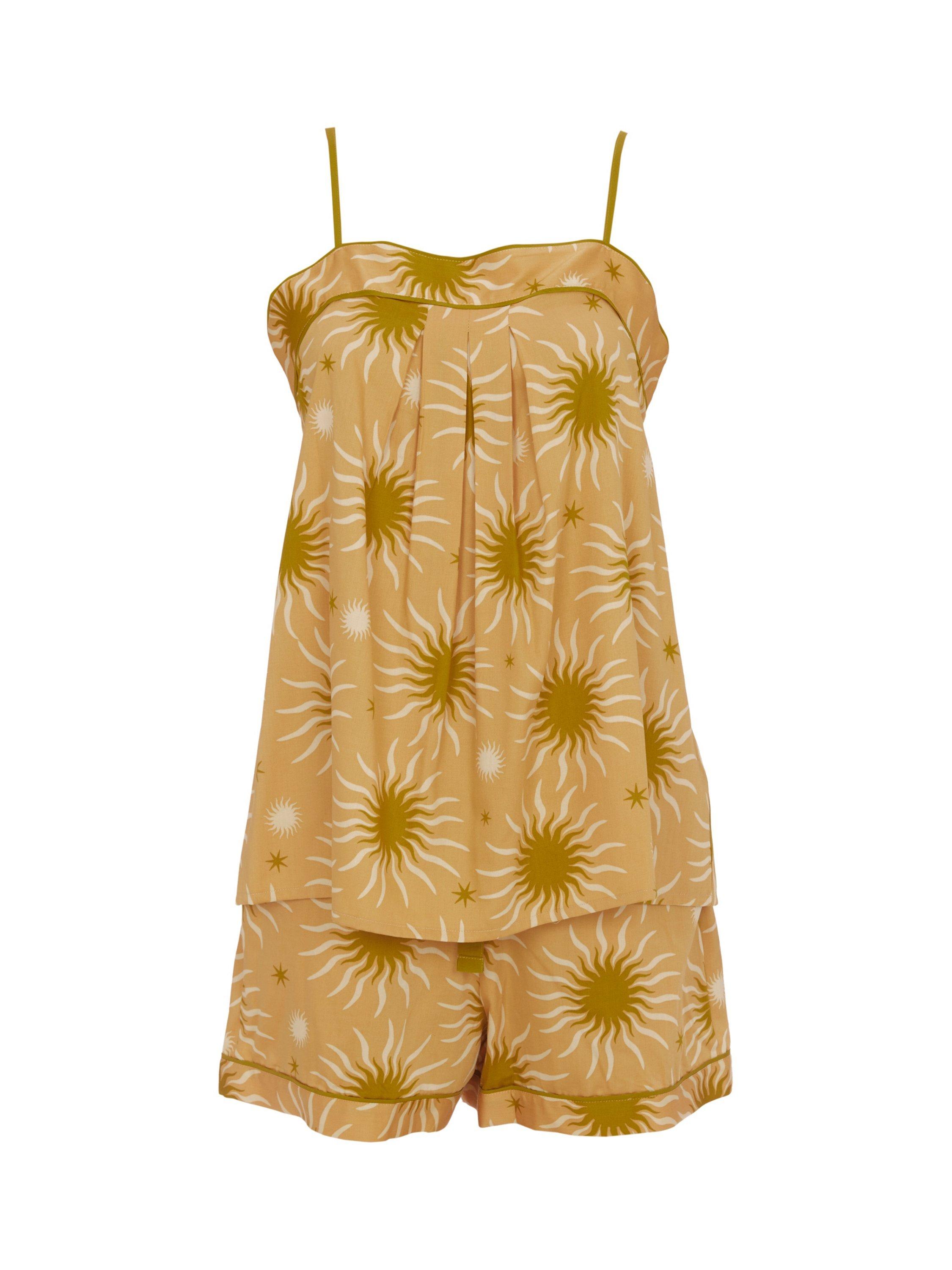 When your pyjamas are having you feeling as comfy and looking as energetic as you will with the Hoxton Sunshine Abstract Sun Print Cami and Shorts Set you’ll be looking forward to relaxing after long days as every day draws to a close. With an abstract sun print against a background making this set perfect for both sunsets and sunrises, and a 68% modal and 32% cotton making sure that you’re super comfy the whole time, you can be sure you’ll be in a relaxed state of bliss. With a shaped front and straight back, adjustable straps, and box pleats detailing the cami top, and a flat front, elasticated waist, and cuffed hems detailing the shorts, this set has an effortlessly playful and sleek silhouette. Modal piping across the whole set, a keyhole detail and singular embossed button detailing the back neck, and an adjustable drawstring, this set has a luxe finish that you’ll love. Whether you’re soaking in the sun’s rays or watching it set, you’ll be supremely comfy and stylish rocking this short and playful set.