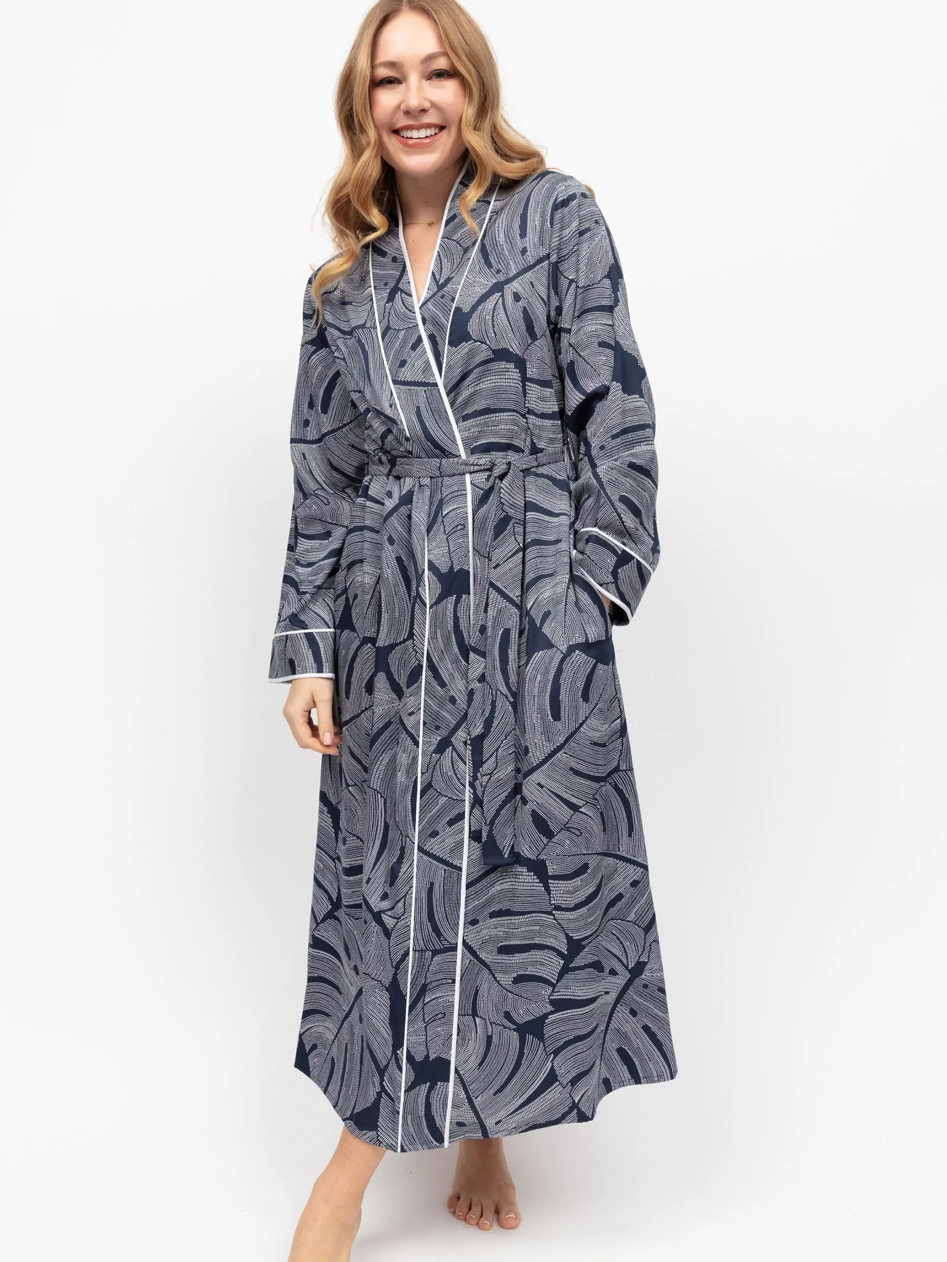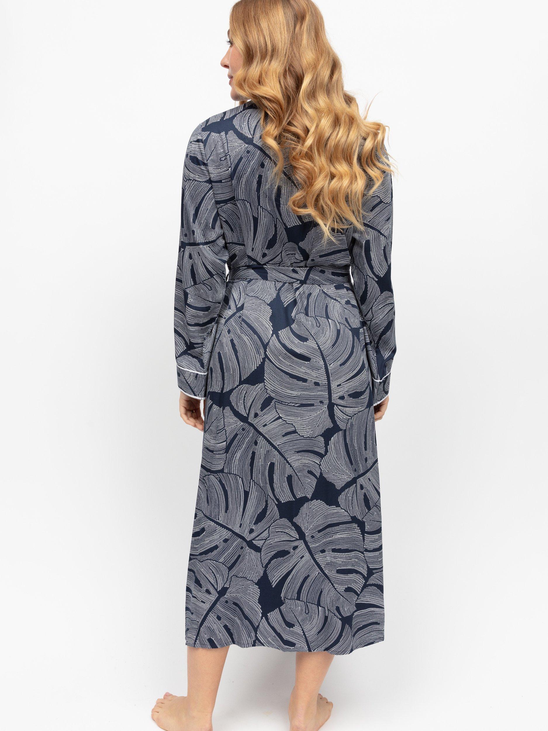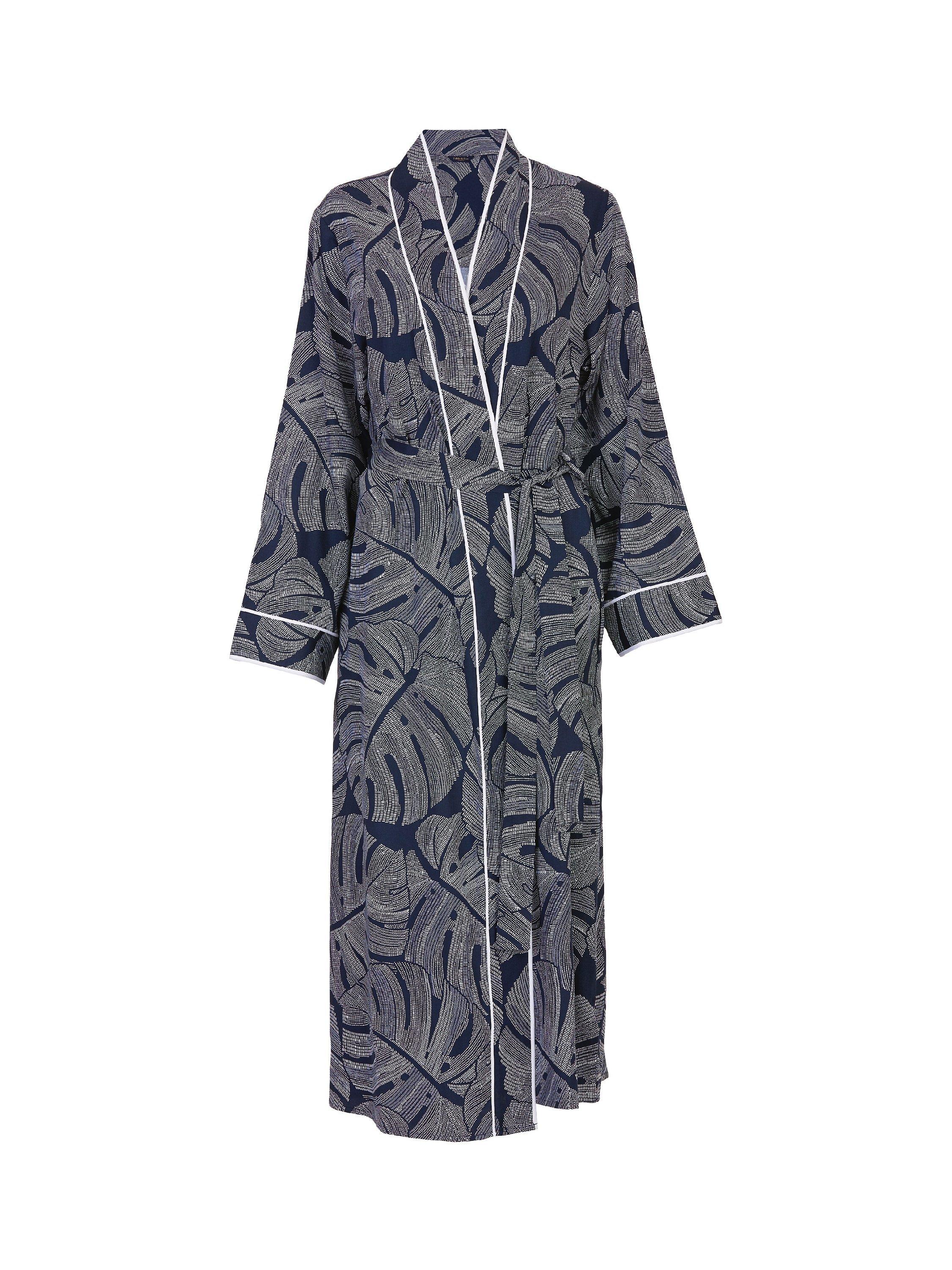 Experience evenings of unparalleled comfort and green-thumbed sophistication with this Knightsbridge Mix Woven Leaf Print Long Sleeve Long Dressing Gown. Meticulously crafted from a soft blend of 68% modal and 32% cotton, and printed with a graceful monstera leaf print on a deep canvas, this dressing gown is the perfect mix of comfort and natural elegance. Featuring long cuffed sleeves and a kimono-like collar, with delicate modal piping and binding, adding a touch of luxury to your loungewear ensemble.