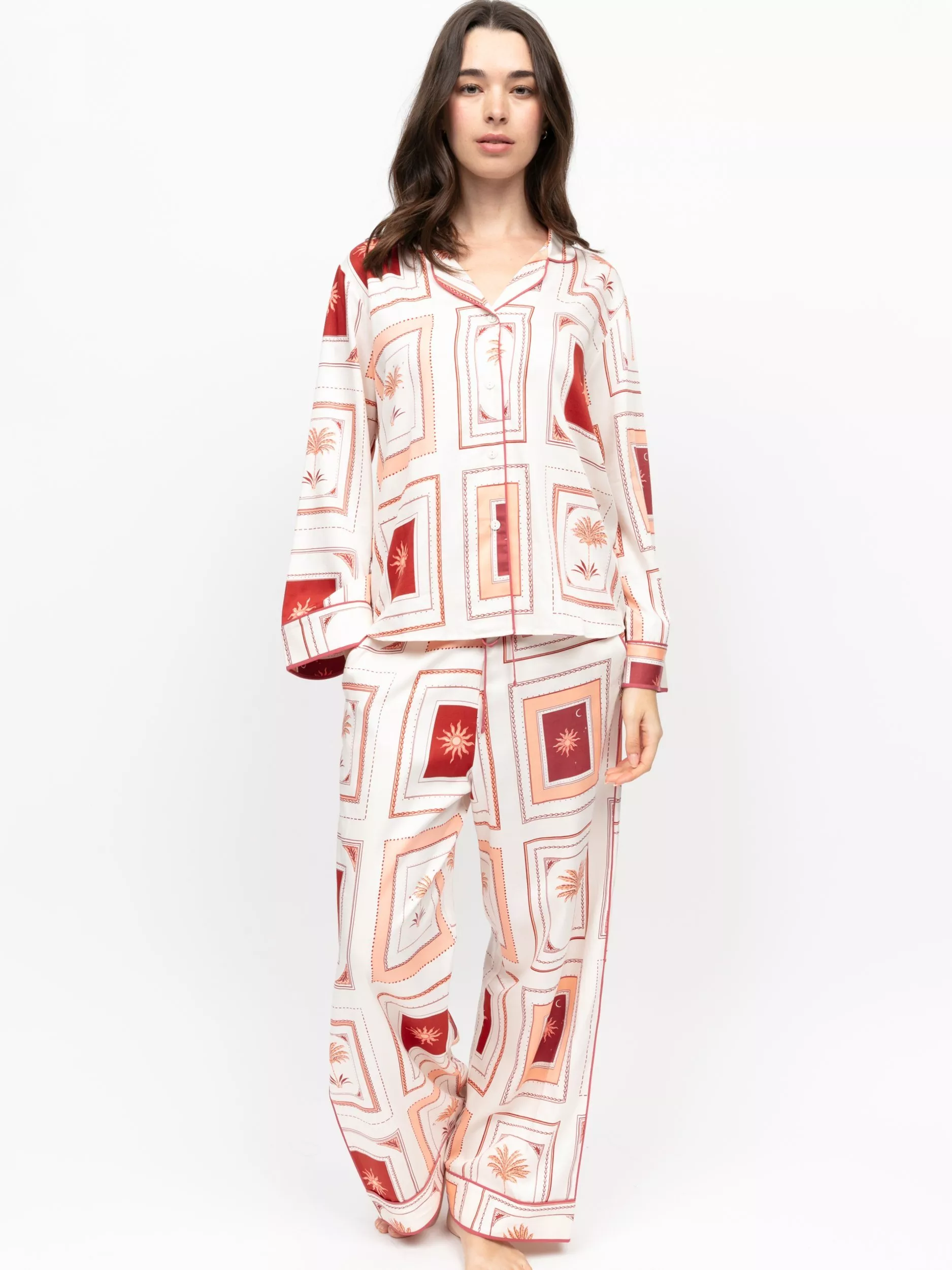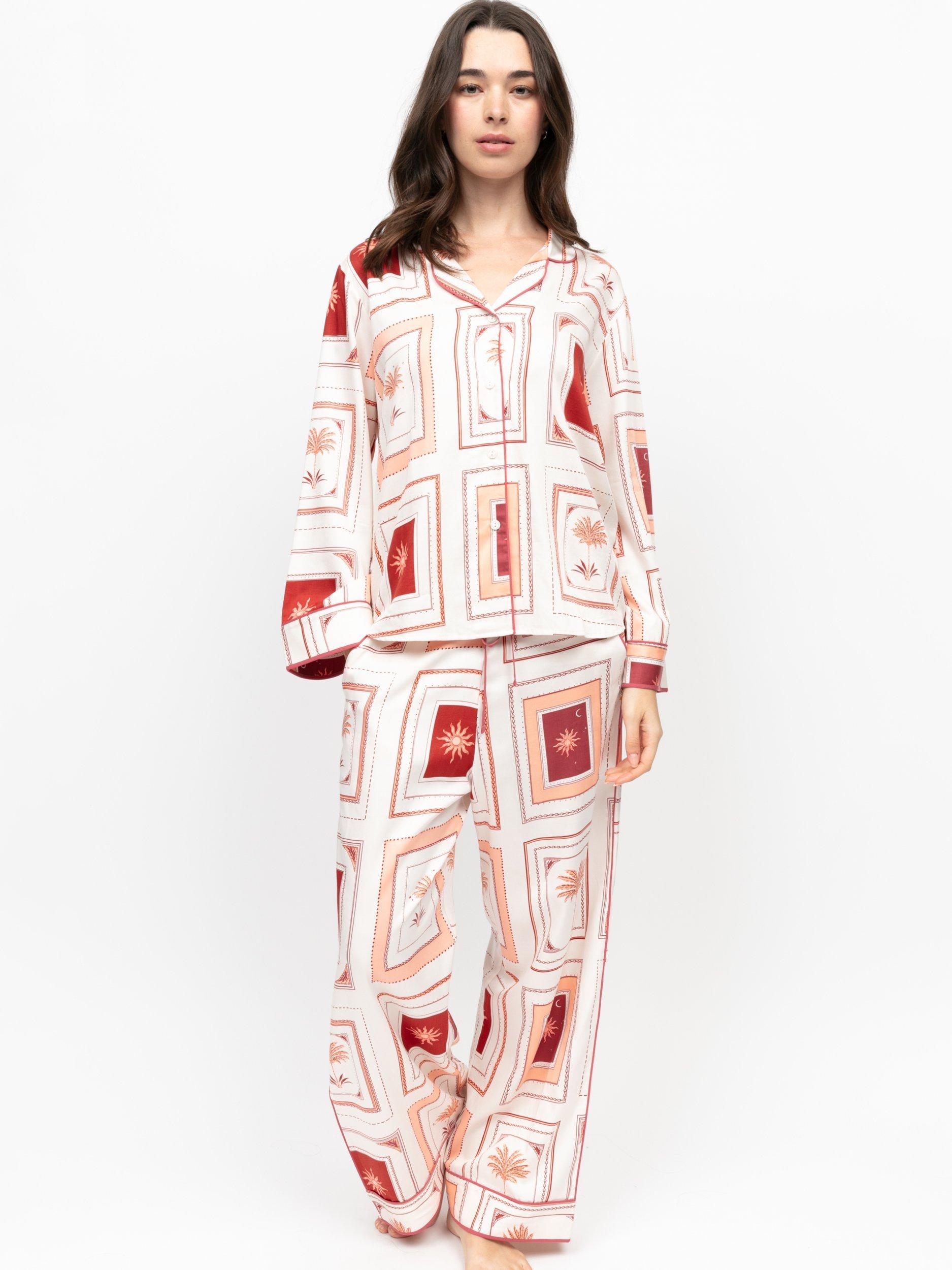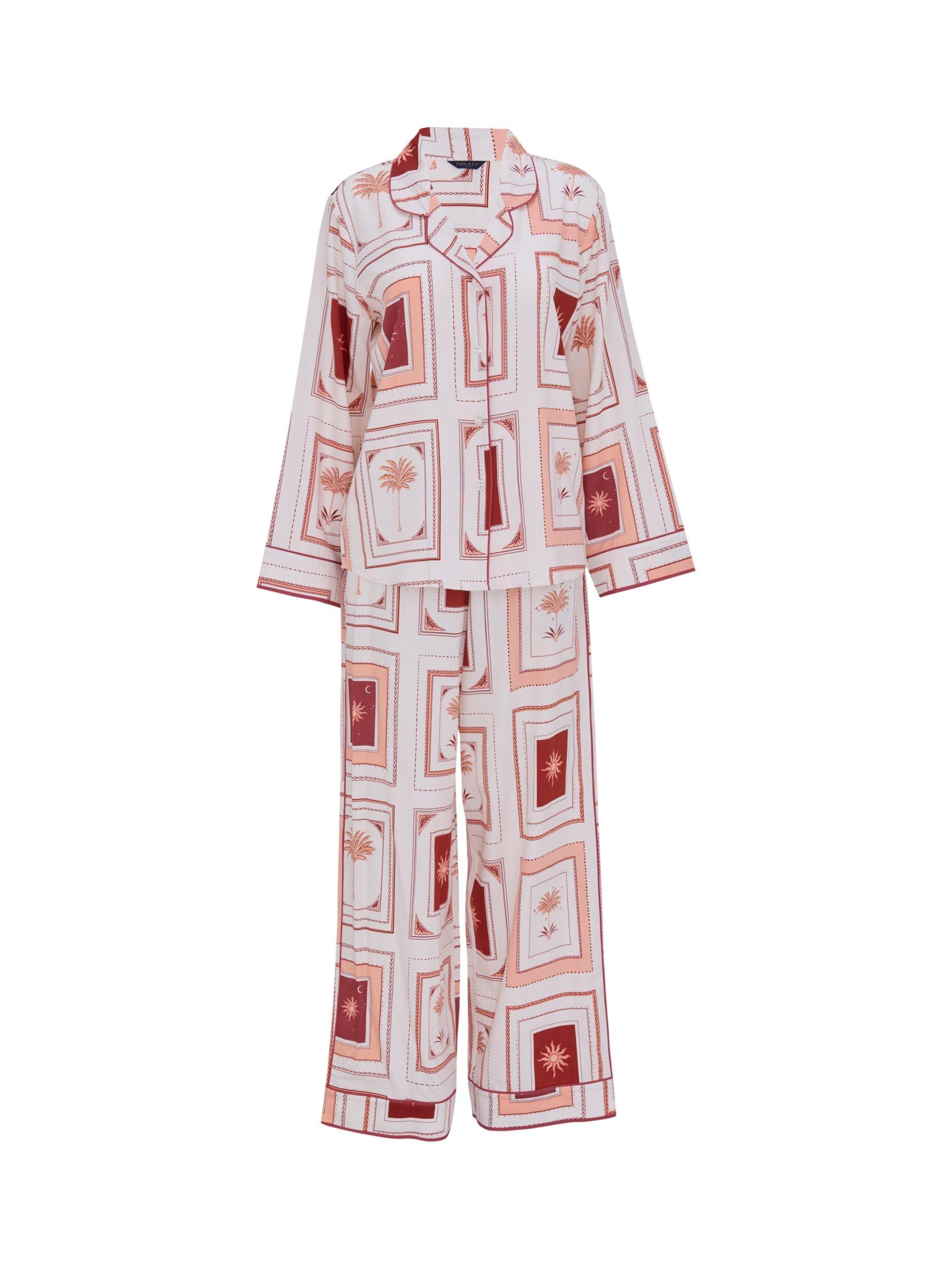 Cut from a soft 68% modal and 32% cotton blend, this matching long sleeve top and wide leg bottoms set is brought to life a collage of postcards, a set of souvenirs to remind you of somewhere sunny when you’re lounging on the sofa.