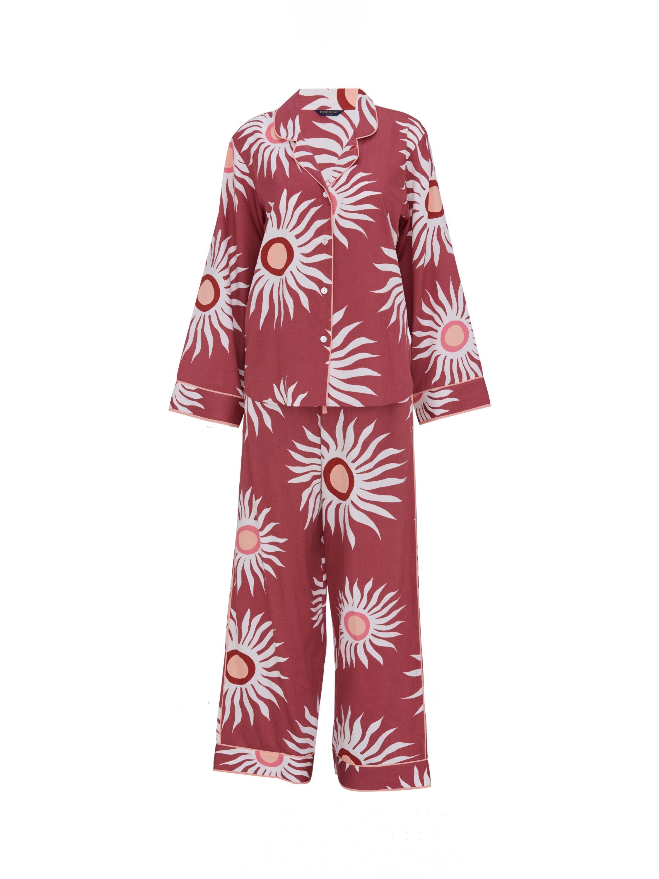Made from an extra soft blend of 68% modal and 32% cotton, this matching long sleeve top and wide leg bottoms set is printed with an energising and lively pattern of abstract suns.