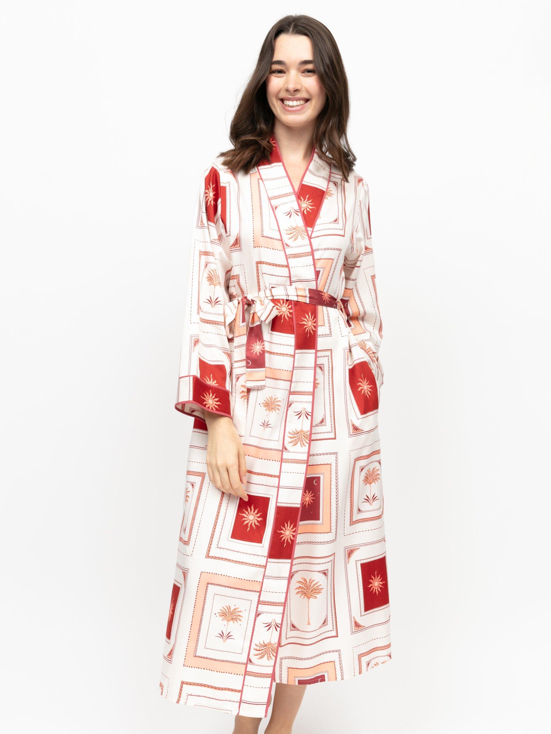 This wrap-front dressing gown comes in an extra soft 68% modal and 32% cotton blend, and features a sun-drenched postcard collage. The gown has a relaxed kimono-style fit that drapes beautifully without clinging, with long cuffed sleeves. Fastening with both a fabric belt and inner satin ties, it can be adjusted to whatever level of loose or snug suits you.