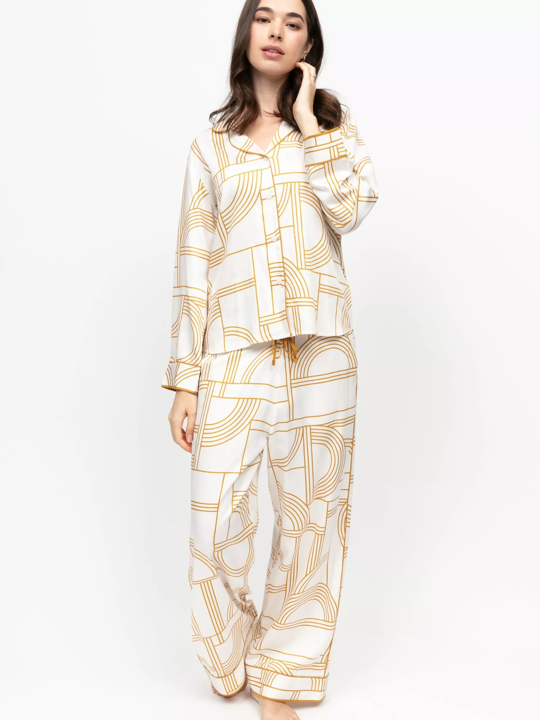 Fable & EveVictoria Geometric Button Through Long Pyjama Set, Victoria Cream