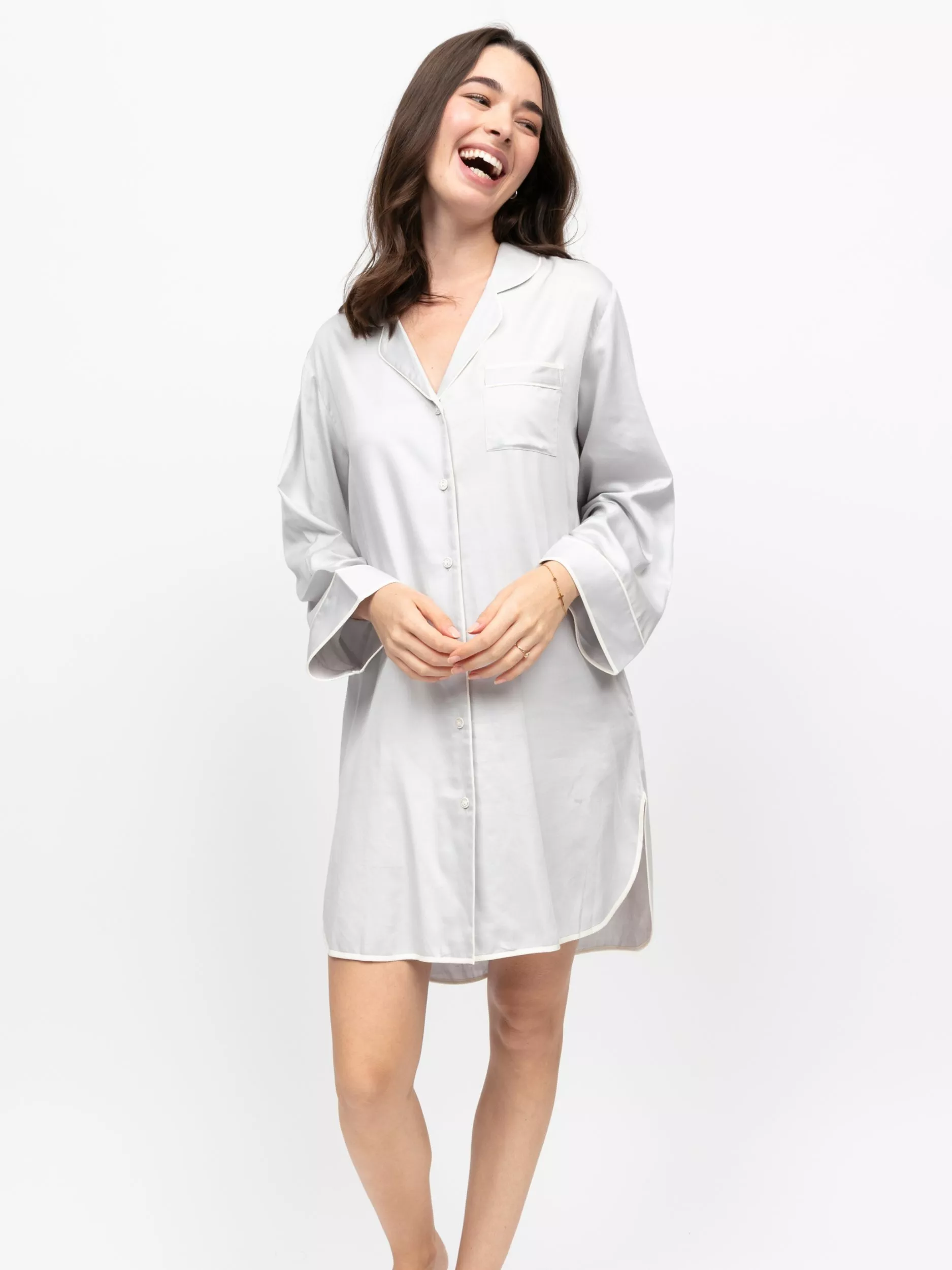 Pyjamas for when the world can wait. Make your downtime’s stillness feel like a scene worthy of capturing in our Victoria Silver Grey Nightshirt. Cut in a soft, lustrous blend of 68% modal and 32% cotton, this silver-grey and long sleeved nightshirt glides across the skin. Shrouded in a sense of calm, this nightshirt is detailed with cream modal piping to highlight the cuffs, revere collar, and shaped bottom hem. At the same time, long sleeves, a shaped chest pocket, and a full button placket bring familiar structure to your moments of quiet. It’s funny how it takes sleepwear made with intention to remember that downtime can be treated in a similar fashion. Funny as it may seem, this is sleepwear for reminding you that lounging can be both intentional and indulgent. A sleepwear piece for taking your evenings slowly, steadily, and with more than a bit of stillness. "Product specification