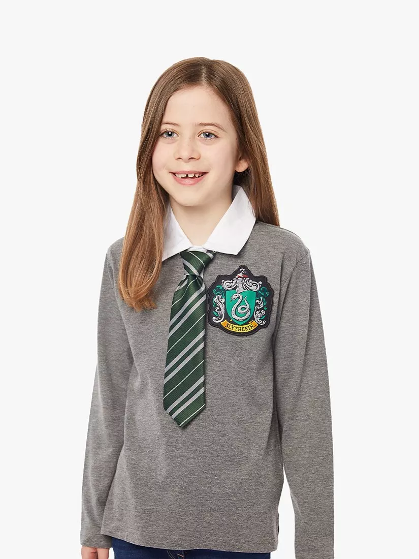 Cunning and born leaders - support your house in style with this custom Syltherin uniform long sleeve tee. Featuring a detailed embroidered Slytherin crest, contrast woven collar with button fastening and a tie - this is one to wear for potions class or for trips to the restricted section in the library!