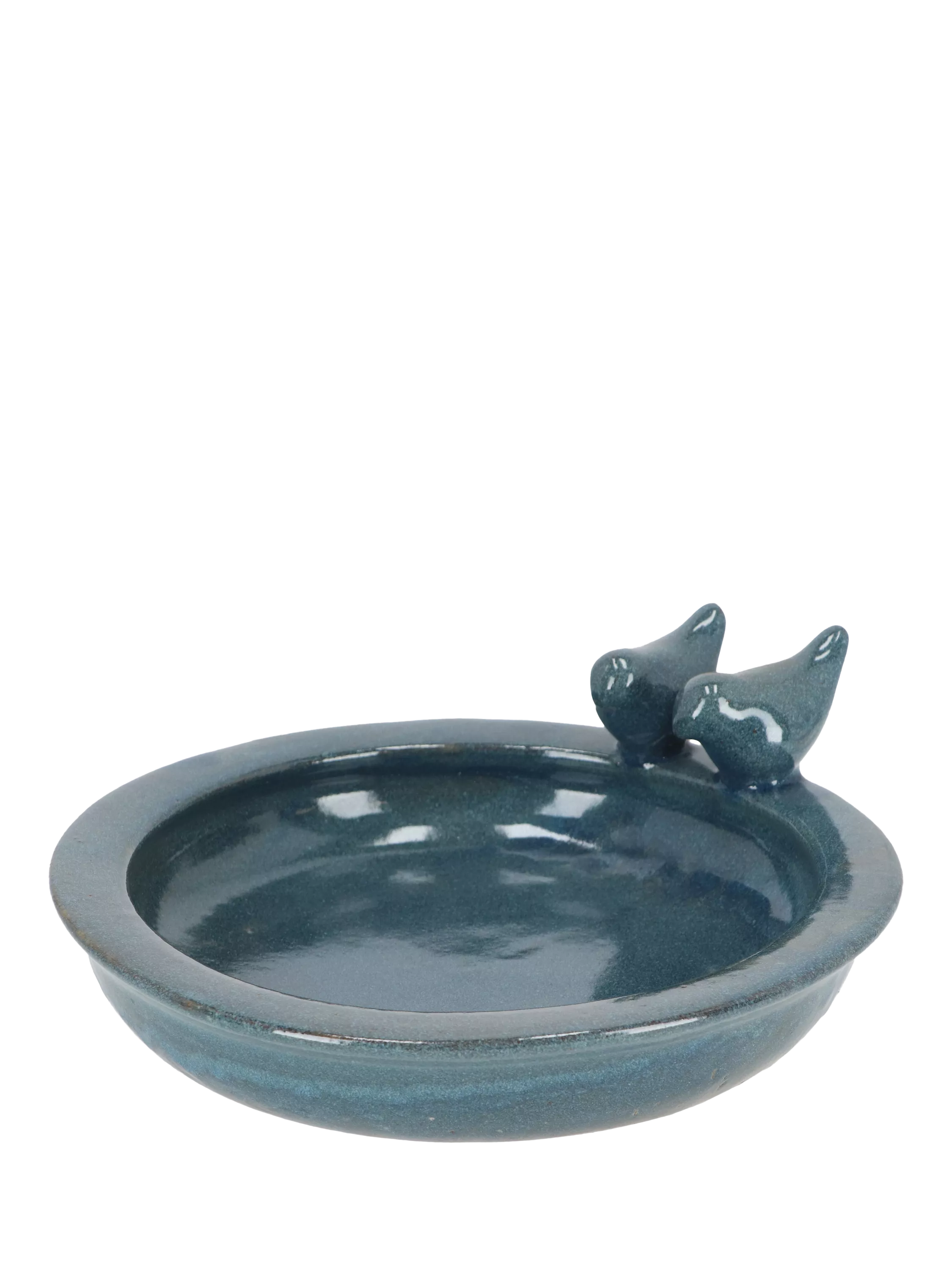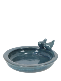 This round bird bath offers the birds double fun. It provides them with a place to drink and bathe, encouraged by two ceramic birds perched on the side. Place this bird bath where it's easily visible. Replace the water and clean the bird bath regularly.