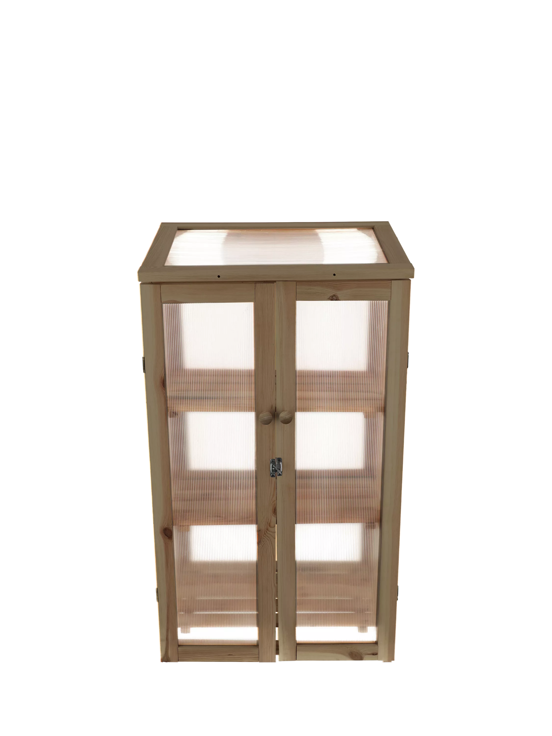 Three shelves offer plenty of space for plants and seedlings with this upright mini greenhouse. Made with a pine wood frame, it features polycarbonate windows to diffuse the light and prevent plants from 'cooking'. The roof can be opened for an extra boost of sunlight.