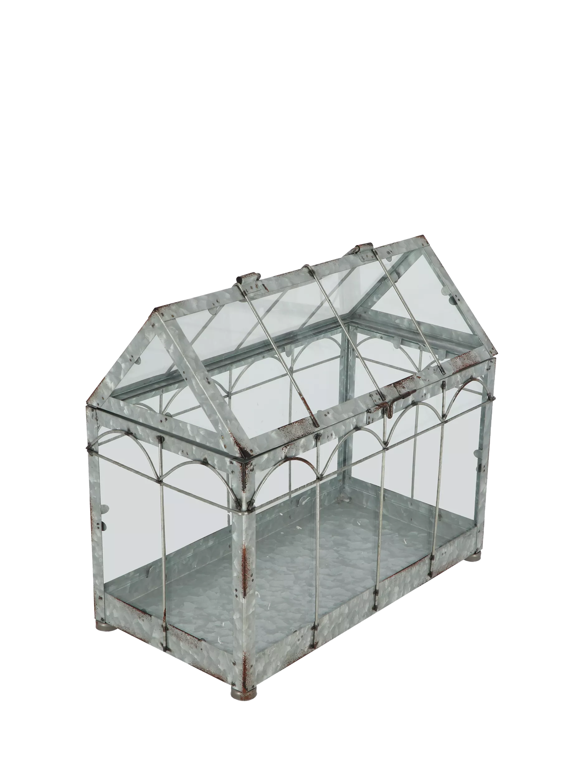 This mini greenhouse has a weathered iron frame and decorative details, making an attractive design for the garden, as well as a practical piece for protecting seedlings and plants. Panelled with glass, it has a tray base to capture water and a hinged roof for access.
