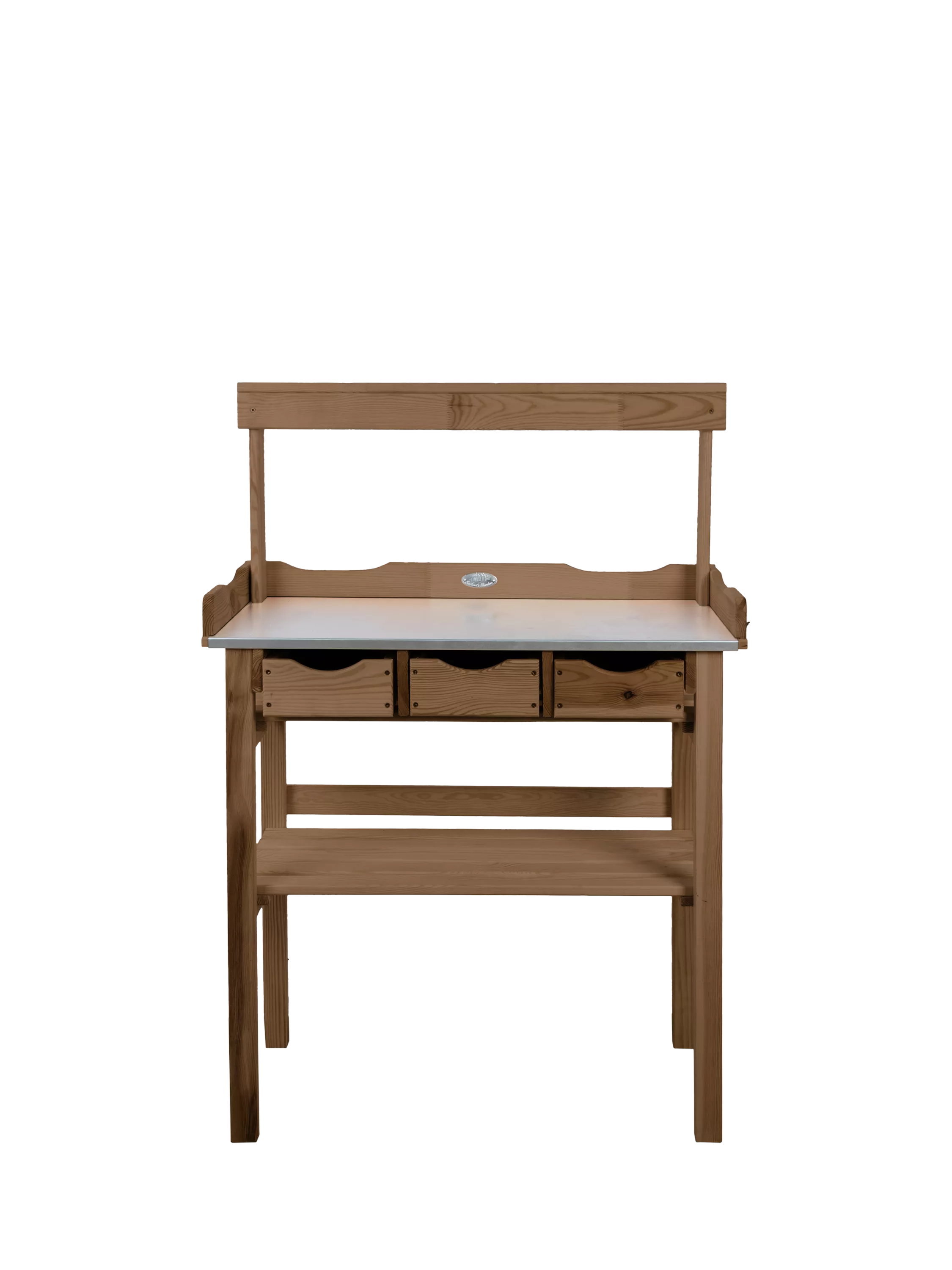 Keep your potting and gardening supplies organised with this potting bench. It has three drawers, a storage shelf, a small upper shelf and a durable, water and rust-resistant zinc top.
