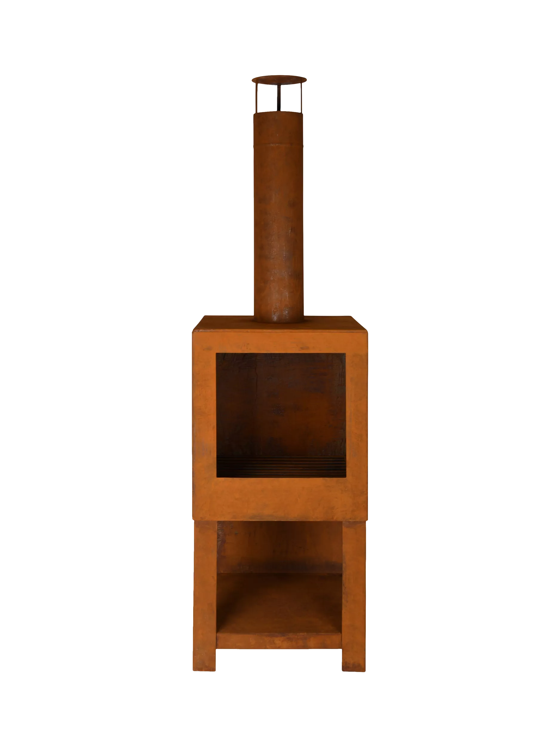 This square chiminea firepit is the perfect blend of form and function. The rustic, weathered steel finish adds an industrial-chic aesthetic, while the built-in wood storage compartment keeps your fuel conveniently on hand.