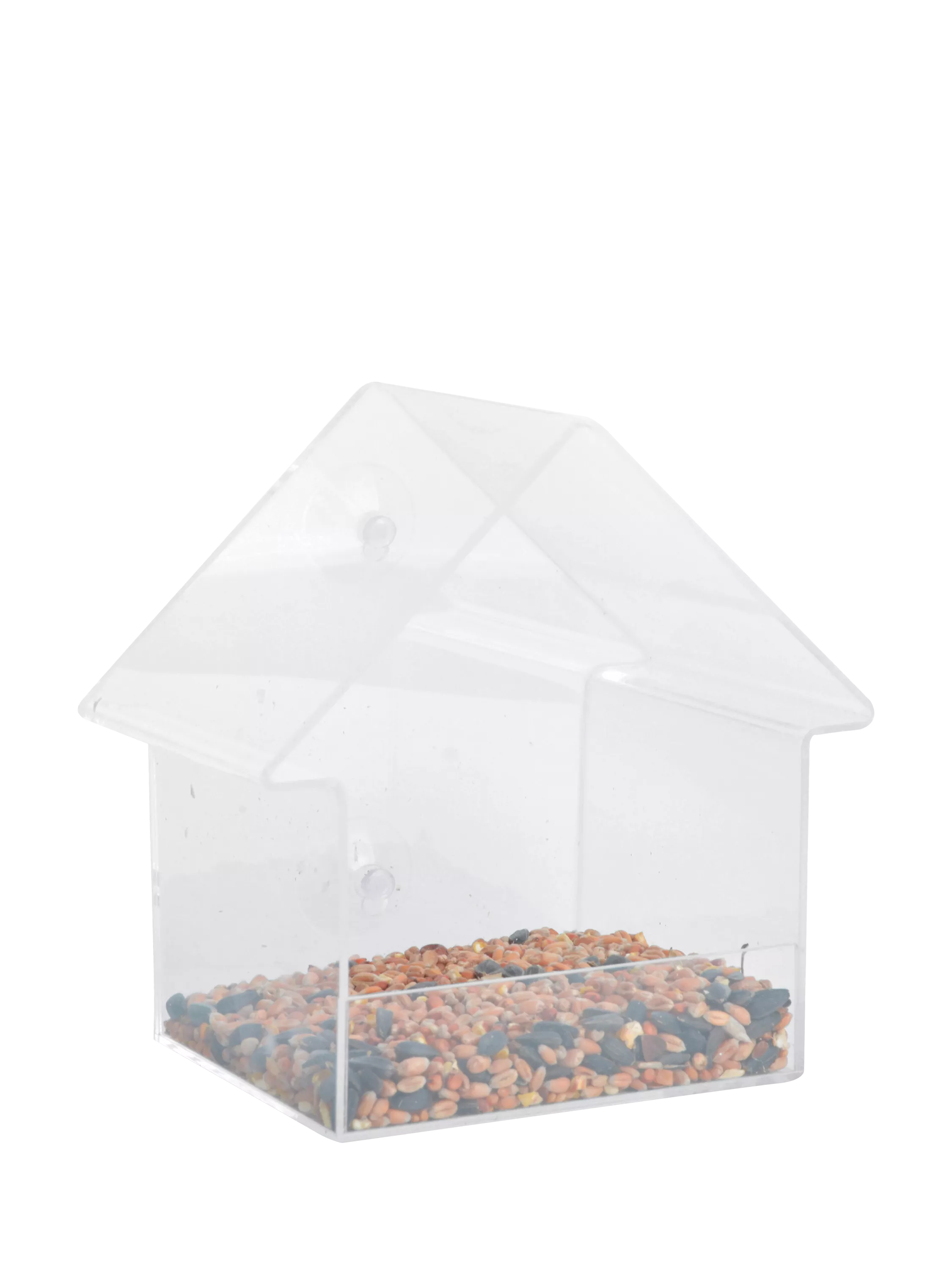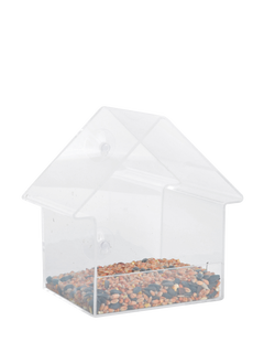 This modern house-shaped bird feeder has transparent walls and a roof so you can see what's happening inside. The feeder can be placed on the window with the two included suction cups. Thanks to the transparent design, you can watch the birds enjoy their food, and the material is easy to clean.