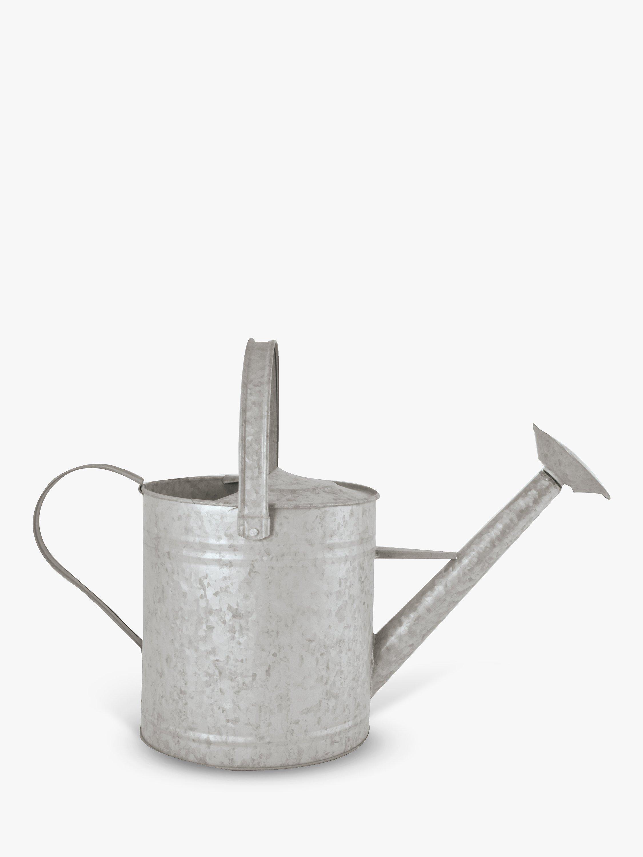 A traditional watering can made of zinc with top and side handles for carrying and pouring.