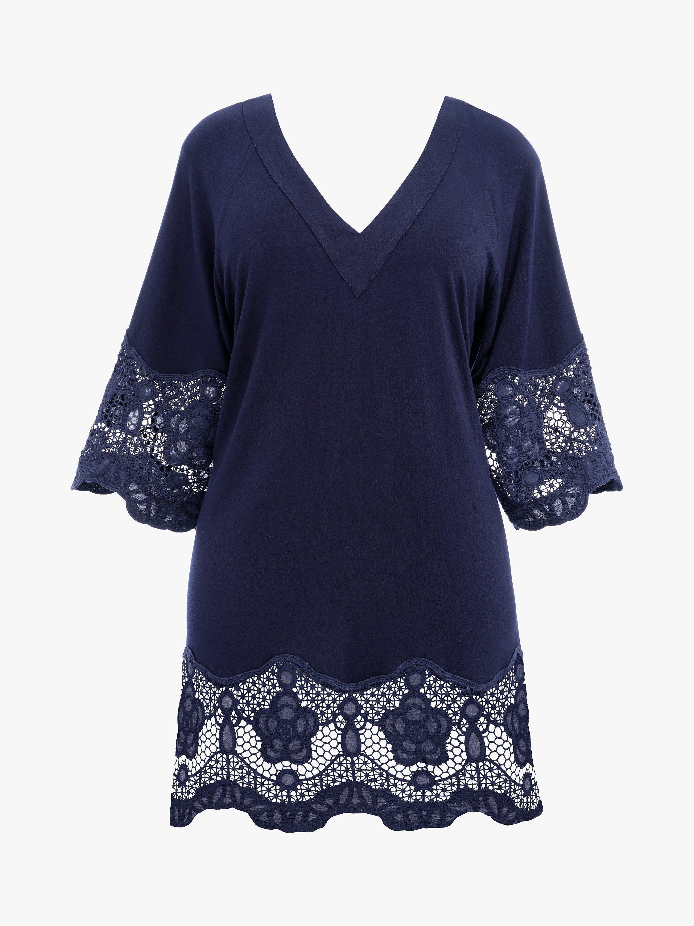 The perfect beach cover up, the Dione tunic features an easy to wear shape with a deep V-neckline and 3/4 length sleeves. It's crafted from a lightweight soft handle stretch jersey fabric for comfort and trimmed with deep guipure embroidered edging on the cuffs and hemline.