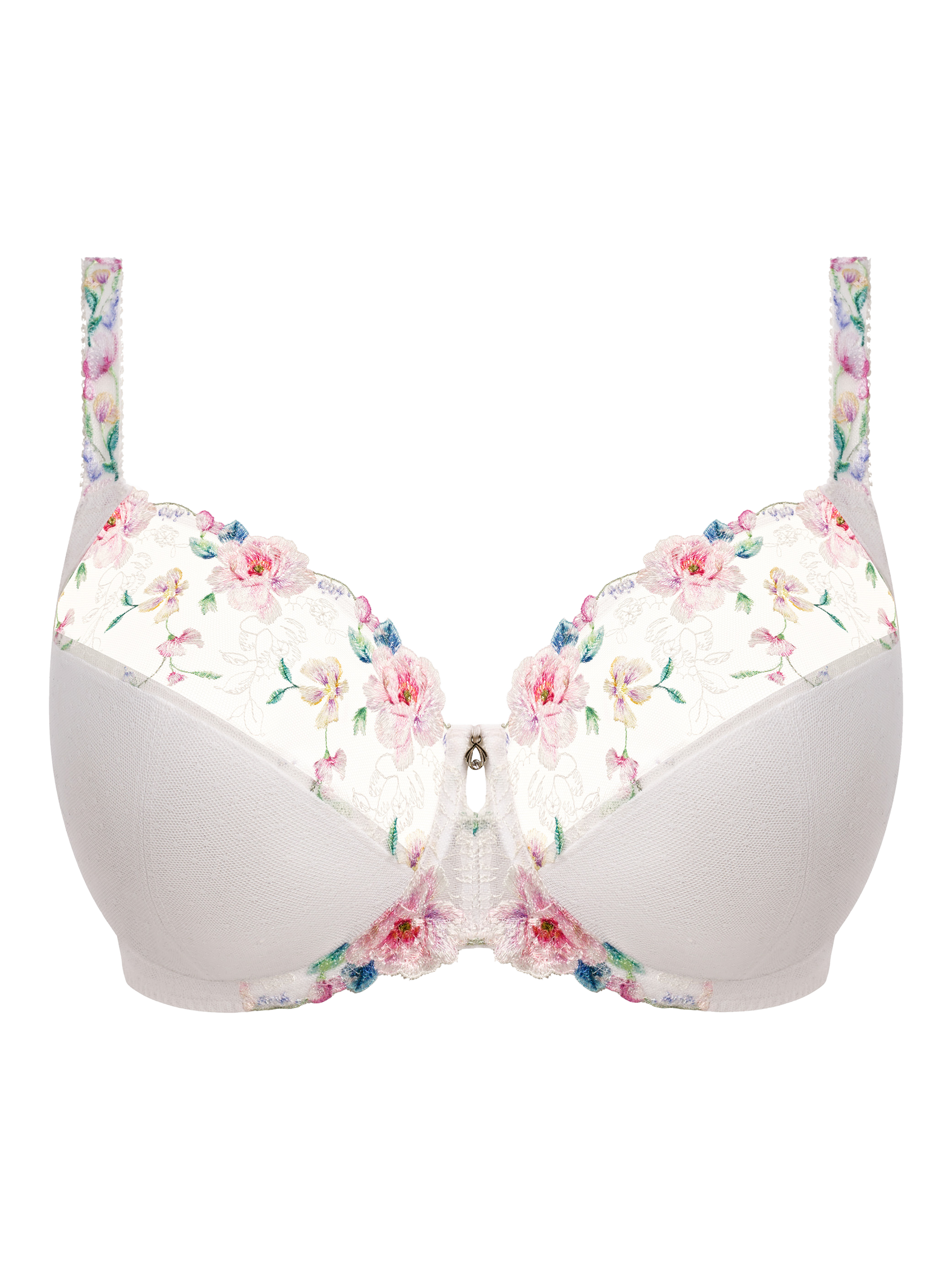 The Lillia Underwire Side Support Bra features a wide wire for additional comfort and support, fully adjustable soft peach skin shoulder straps and three-piece cups with side support for great uplift and forward projection. It's cut lower at the centre front for a plunge neckline and has powernet wings for anchorage and support. Luxurious printed floral embroidery adorns the top cups, cradle and trim on front straps. A keyhole detail at the centre front completes the look. Complete with a 2-hook fastening.