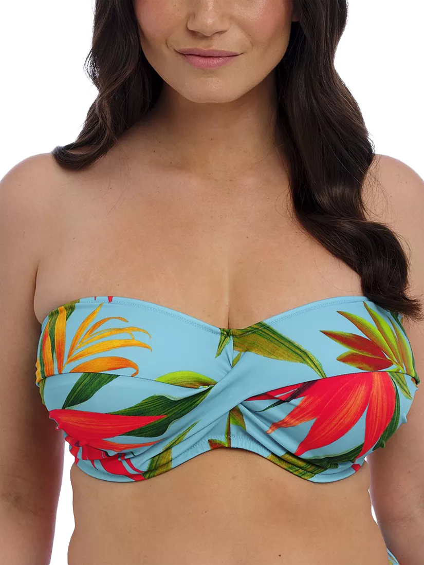 The Underwire Bandeau Bikini Top features lightly padded foam cups for support and a smooth rounded shape, detachable scarf tie straps and powernet lined wings for support and anchorage. The twist front gives a flattering sweetheart neckline.