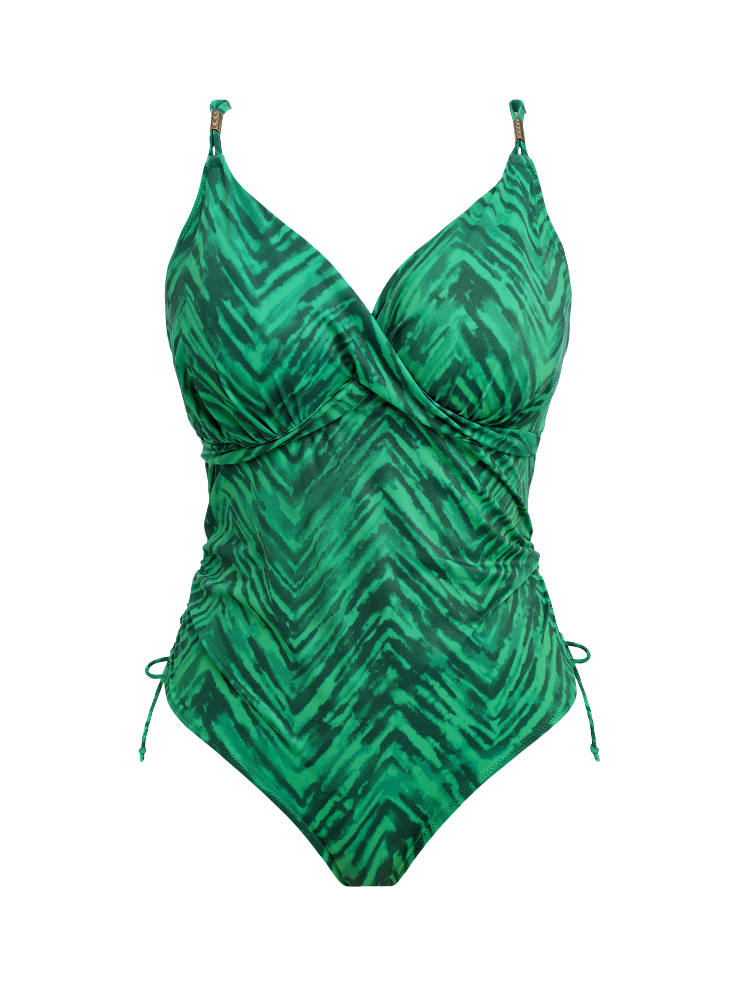 Fantasie's Punta Mita exclusive in-house designed print features a combination of Emerald green hues that make up the zig-zag look of this collection. The Underwire Plunge Swimsuit features a flattering deep plunging neckline with gentle gathers under the bust for shaping, a flattering wrap over front detail with a concealed side sling for forward projection and fixed fully adjustable shoulder straps. Concealed stitching was used for a clean, stitch-free neckline. The metallic gold apex trim detail will not heat up in the sun.