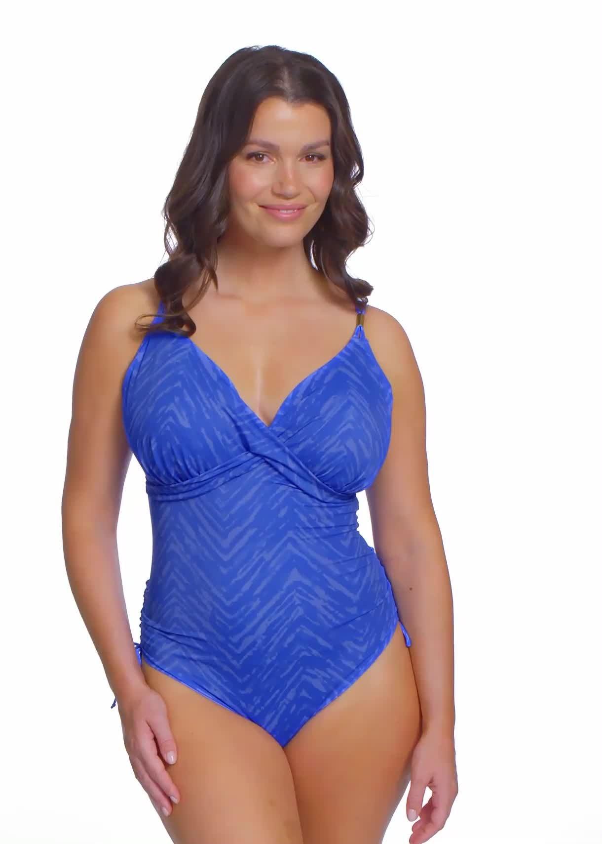 Fantasie's Punta Mita features an exclusive in-house designed zig-zag print. The Underwire Plunge Swimsuit has a flattering, deep plunging neckline with gentle gathers under the bust for shaping, a flattering wrap over front detail with concealed side sling for forward projection and fixed, fully adjustable shoulder straps. Concealed stitching was used for a clean, stitch-free neckline. Metallic gold apex trim detail will not heat up in the sun.