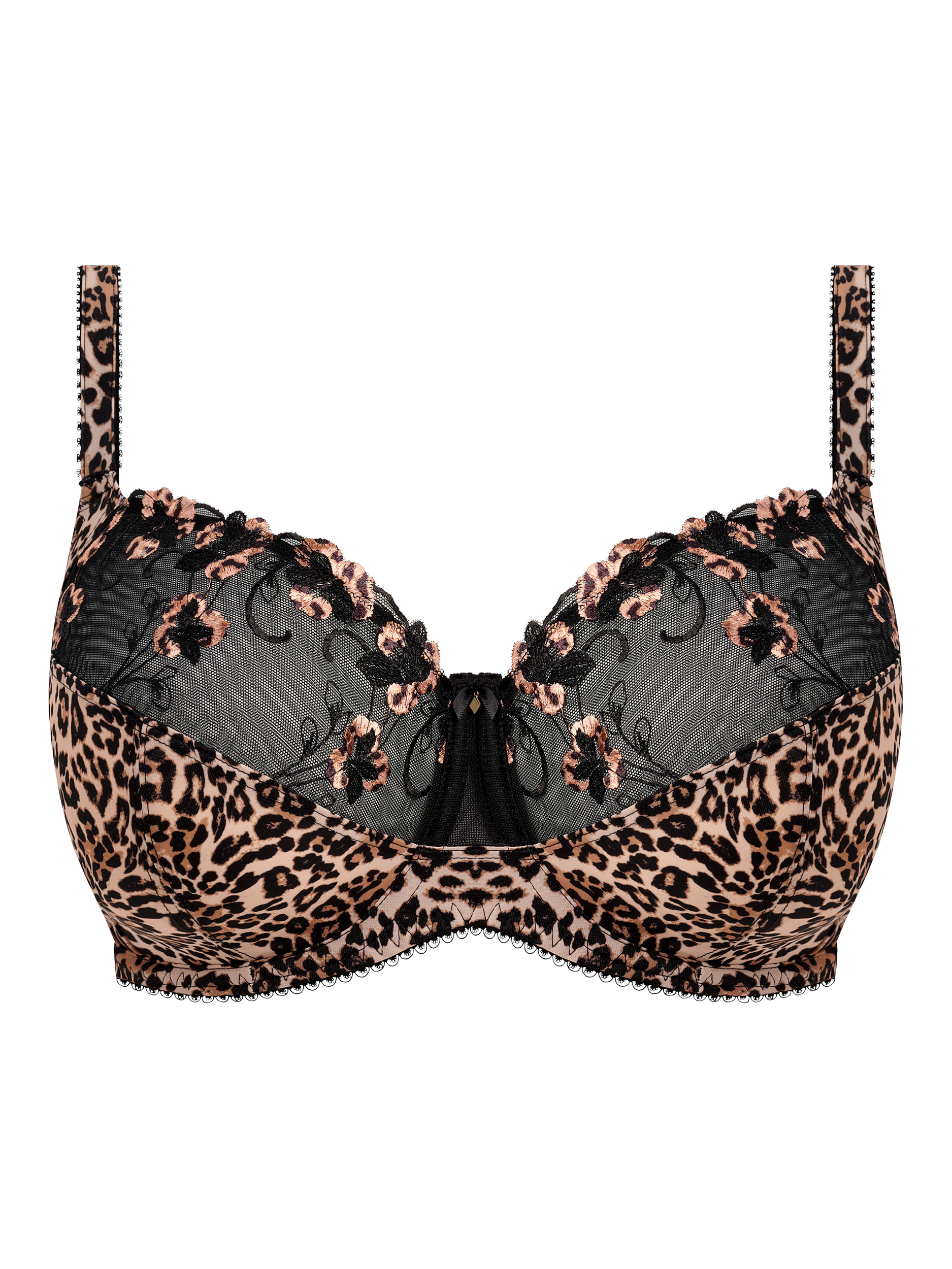 Talia is a Fantasie collection where leopard markings intertwine with romantic florals for a striking design. This underwired bra has a three-piece cup with side support for great uplift and forward projection. It's also wide wired for additional comfort and support and features fully adjustable soft peach skin shoulder straps as well as Austrian-designed printed embroidery in the top cup. A delicate bow detail at the centre front completes the look. Fastens with a 2-hook row on D-G cup sizes and a 3-hook row on GG-J cups sizes. GG-J cup sizes also have lined top cups.