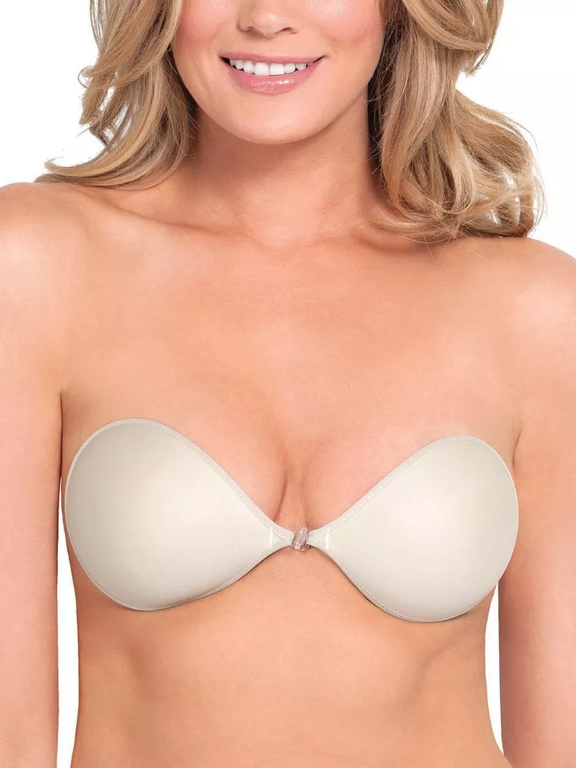 With a front fastener for cleavage and lift, the bra is without a back and has no straps or sides.