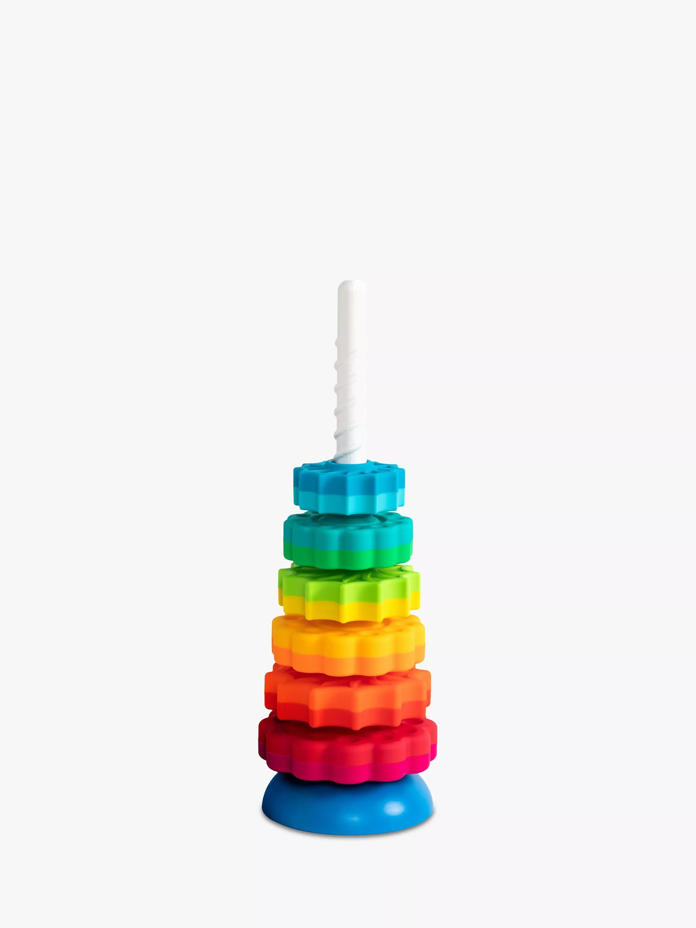 A stacking toy with a twist! Drop the disks onto the corkscrew pole and watch as they spin down to the reversible base. Eye-catching colours include magenta, lime, teal, lemon, red, sky blue and more.