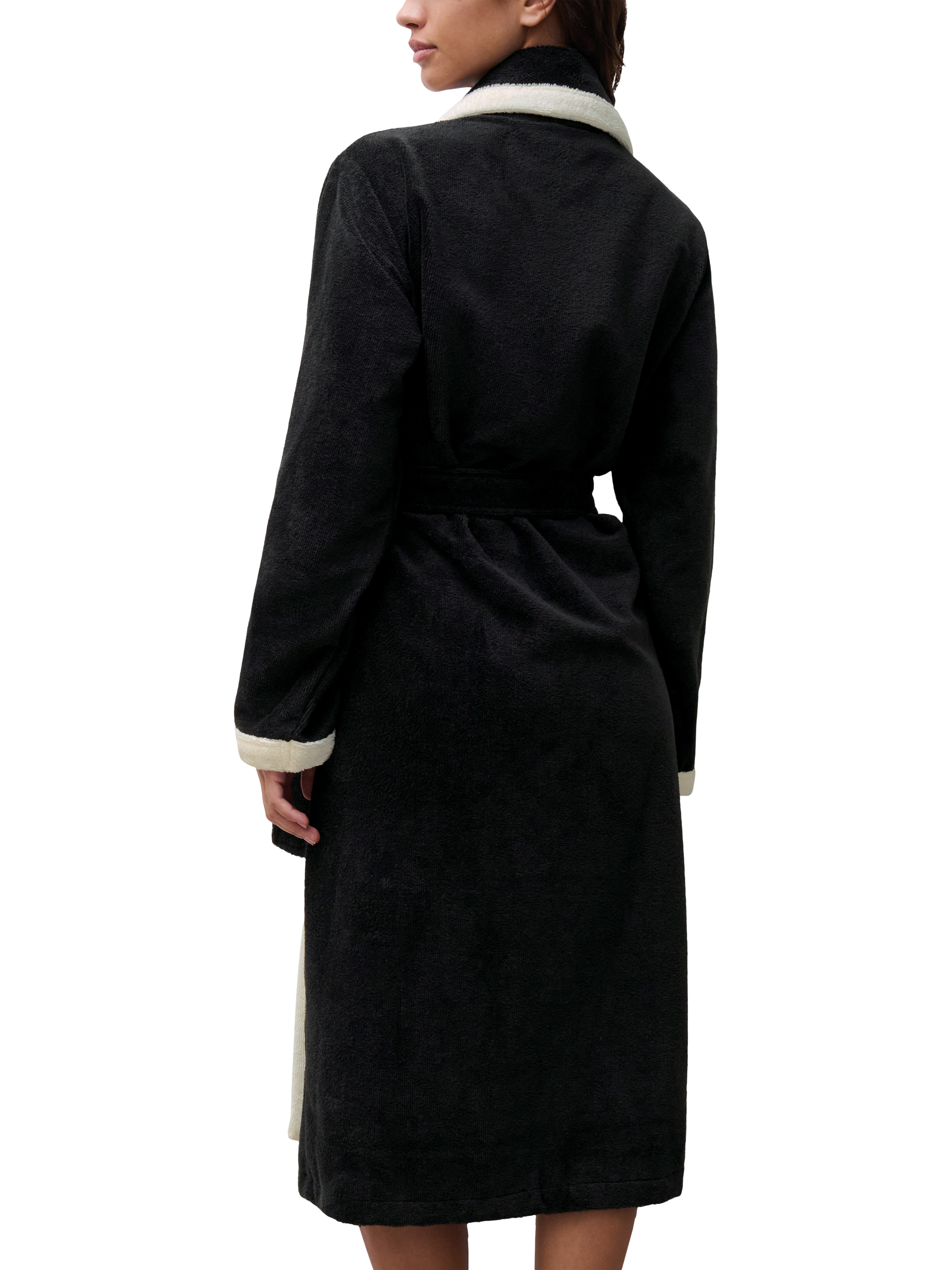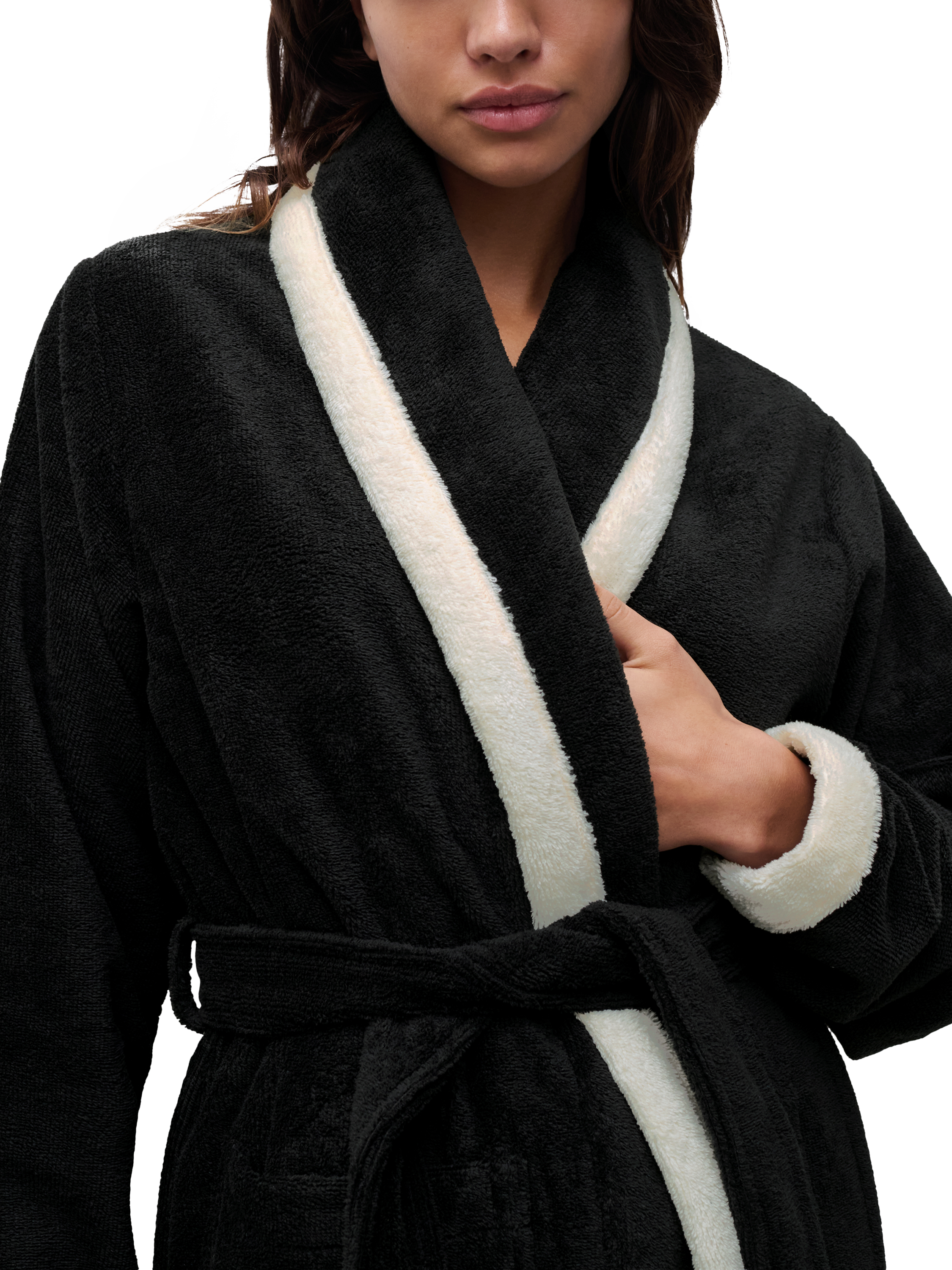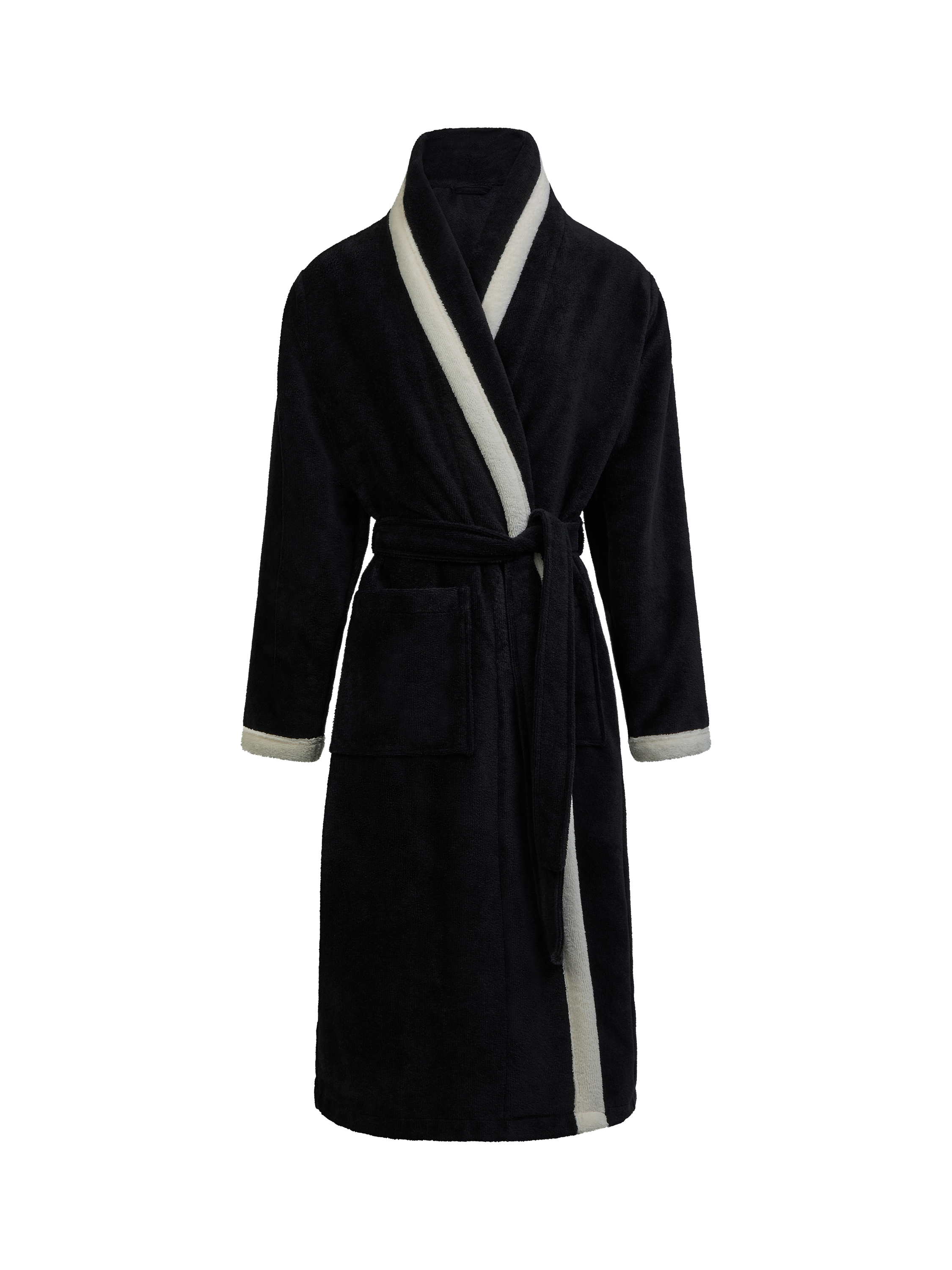 Designed to provide comfort and warmth, this robe is crafted from a cotton and polyester blend. It features a collar finished with a stylish two-tone stripe, plus two practical pockets and a tie belt for a secure, adjustable fit.