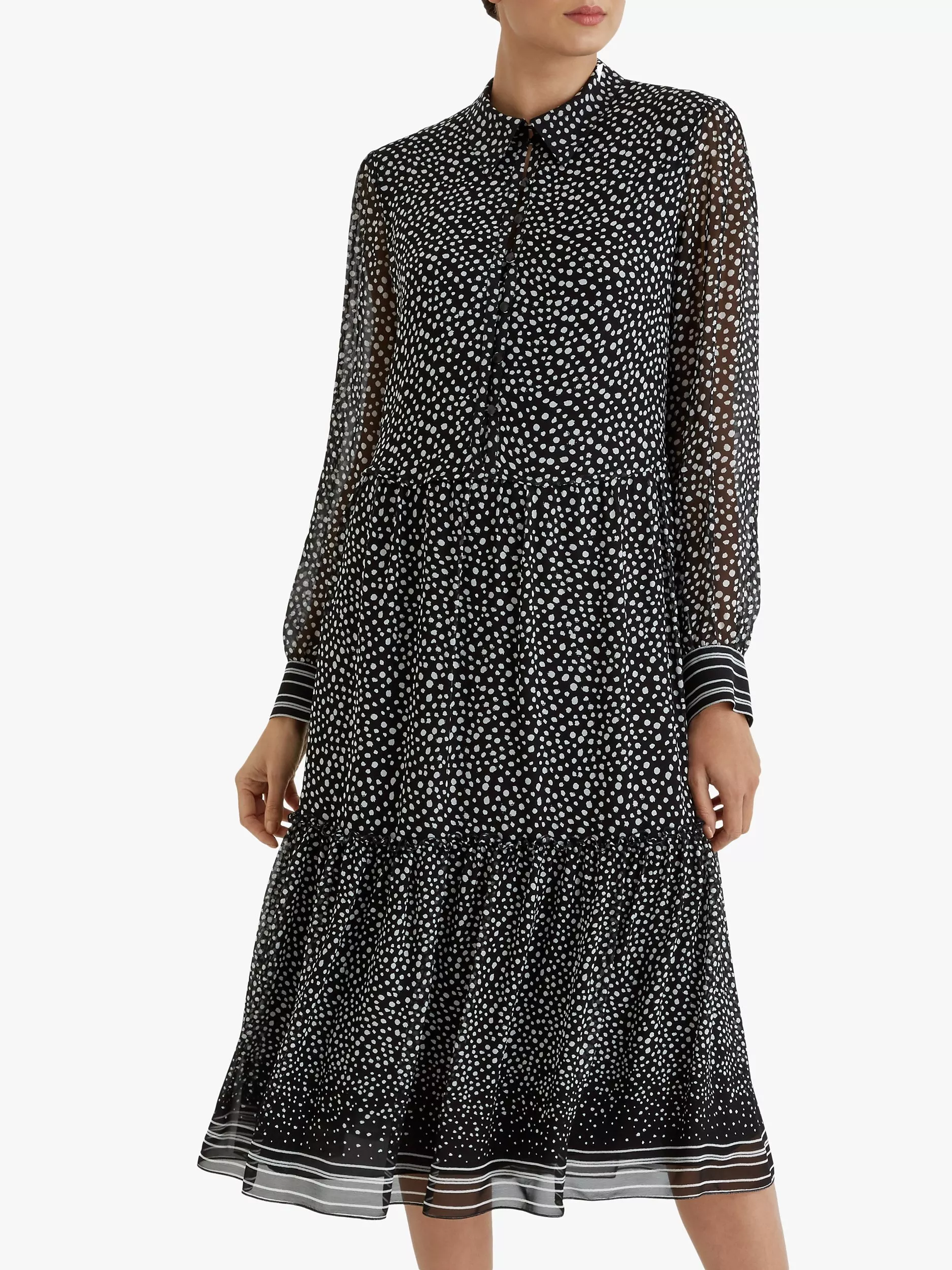 Falling below the knee, the dress gives its hem a little ruffle that makes it all the more charming. A sheer stripe detail at the cuffs and the hem contrasts with the all-time relevant spot motif.