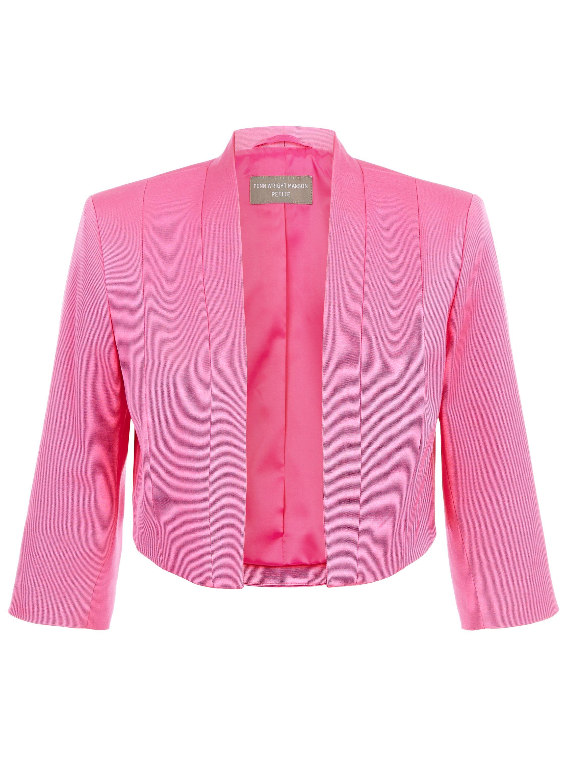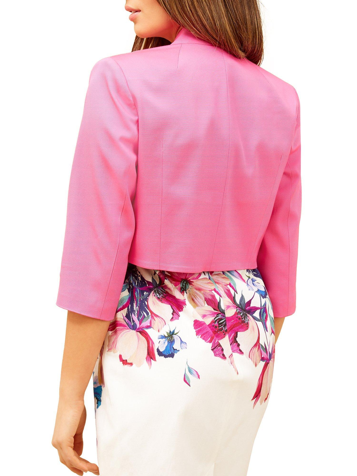 This elegant jacket is crafted with a cropped design, featuring 3/4 length sleeves and a clean lapel-free finish.
