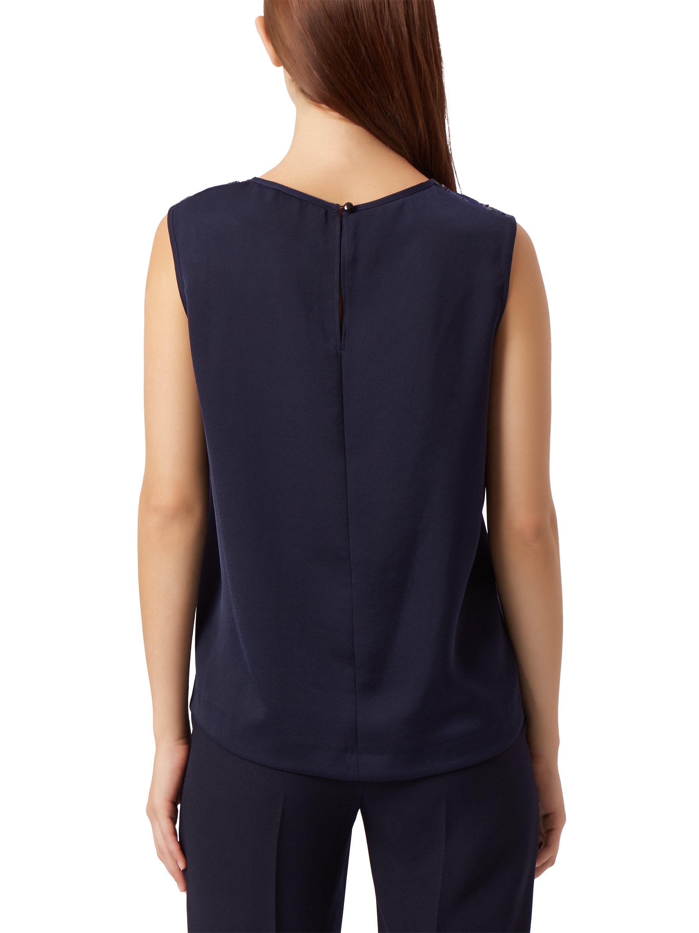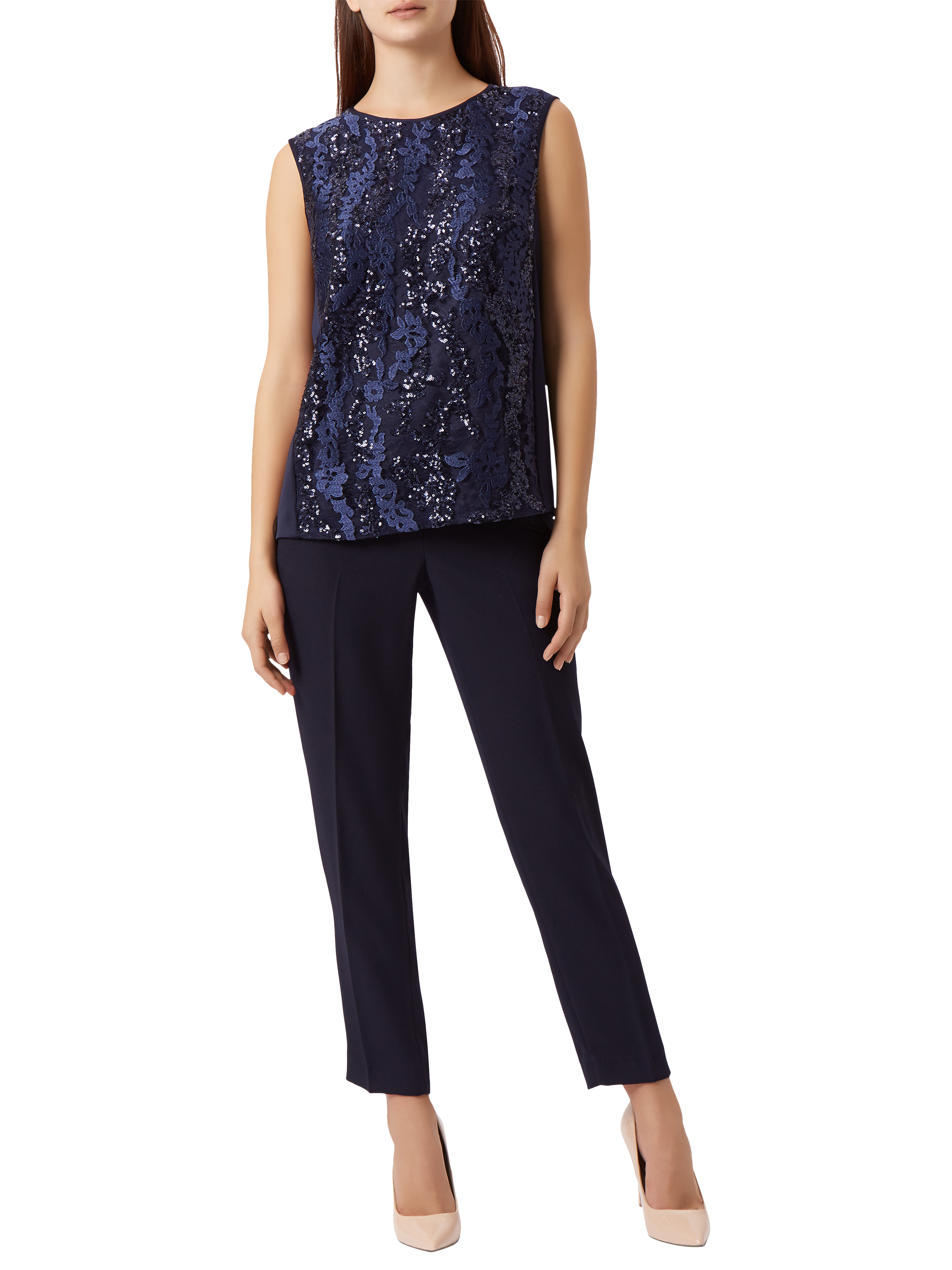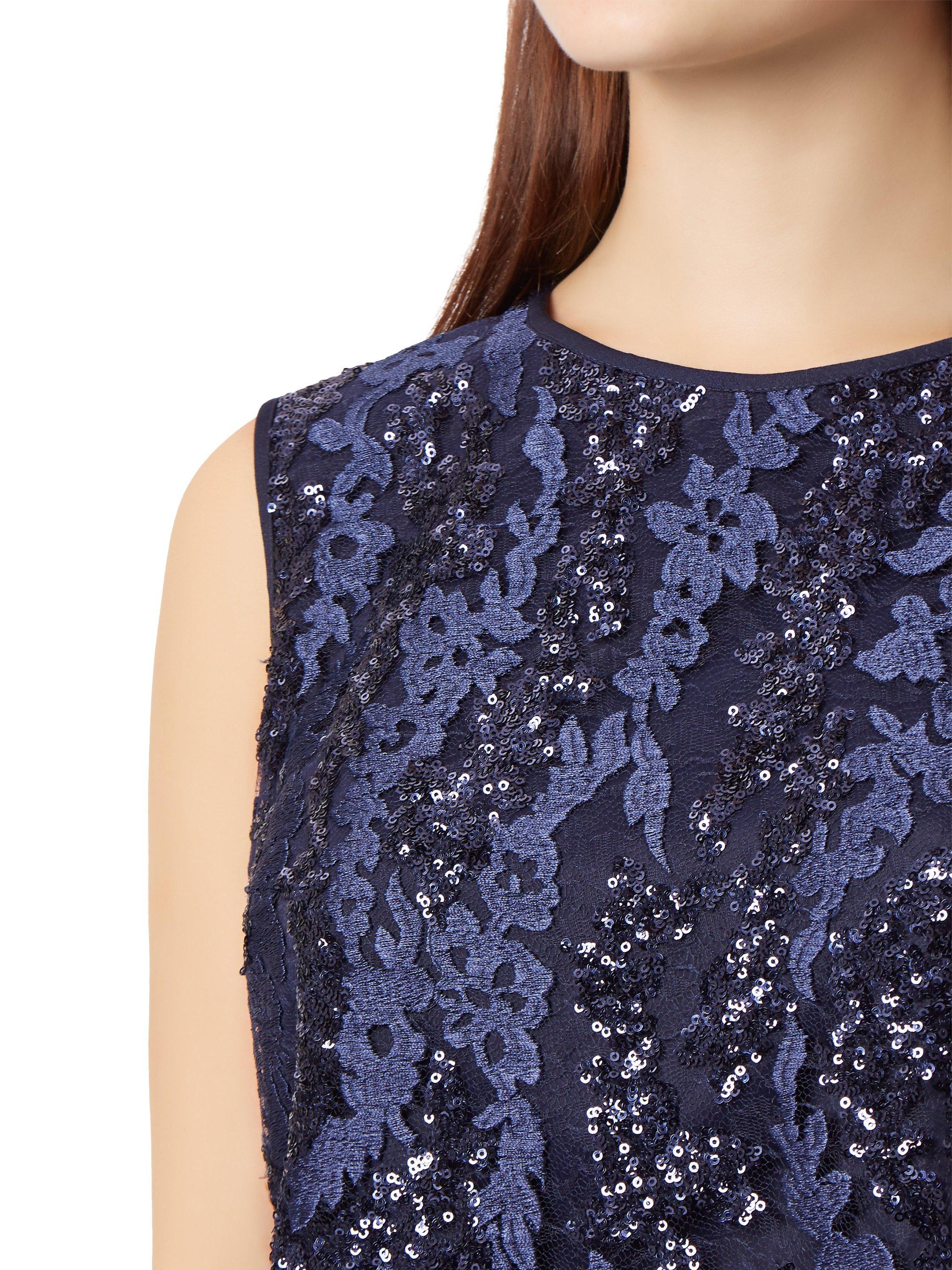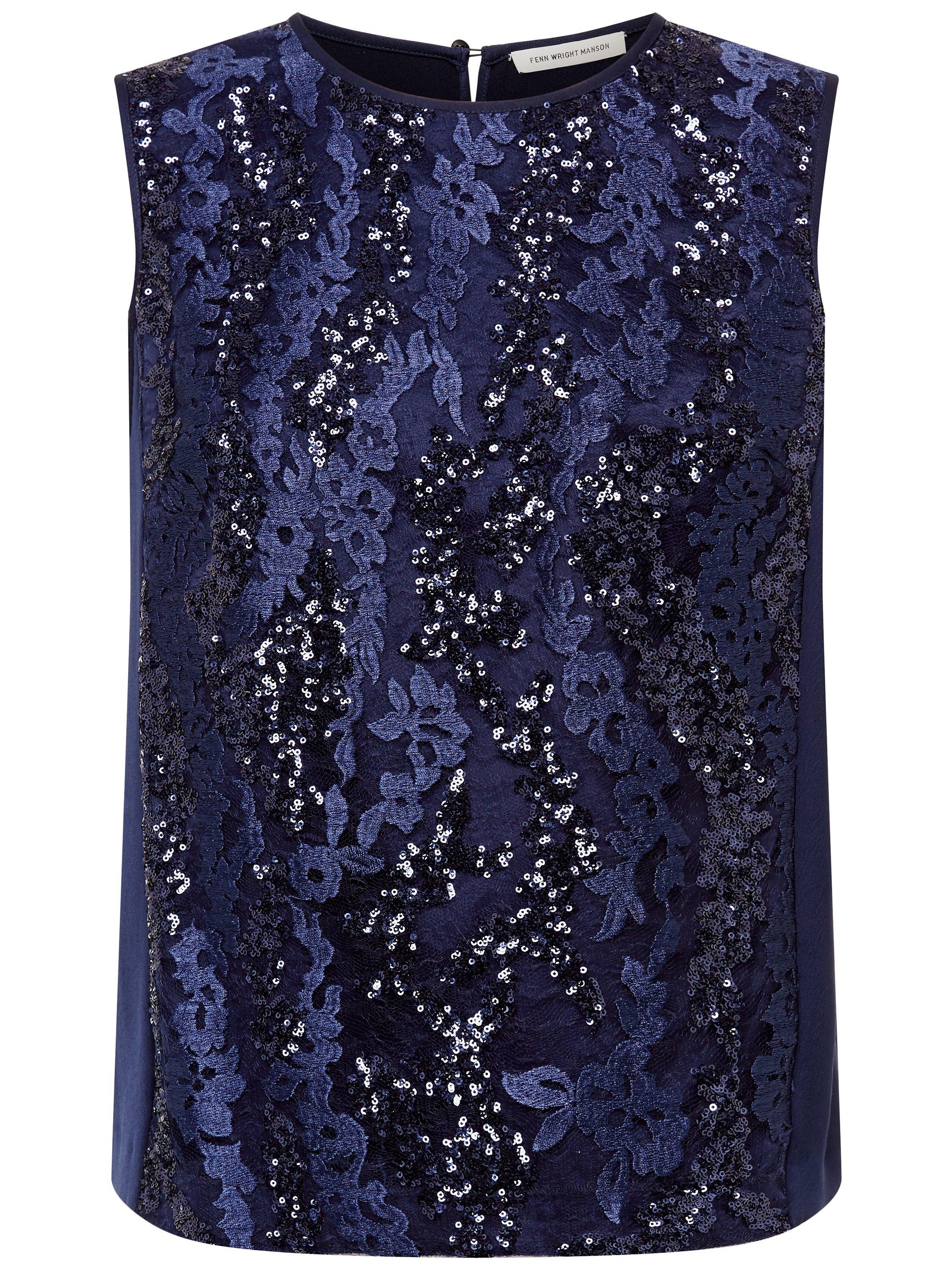Embellished with floral lace and cascading sequins that follow the flow of the design, this sleeveless top is cut to a relaxed shape and features a round neckline and button back fastening.