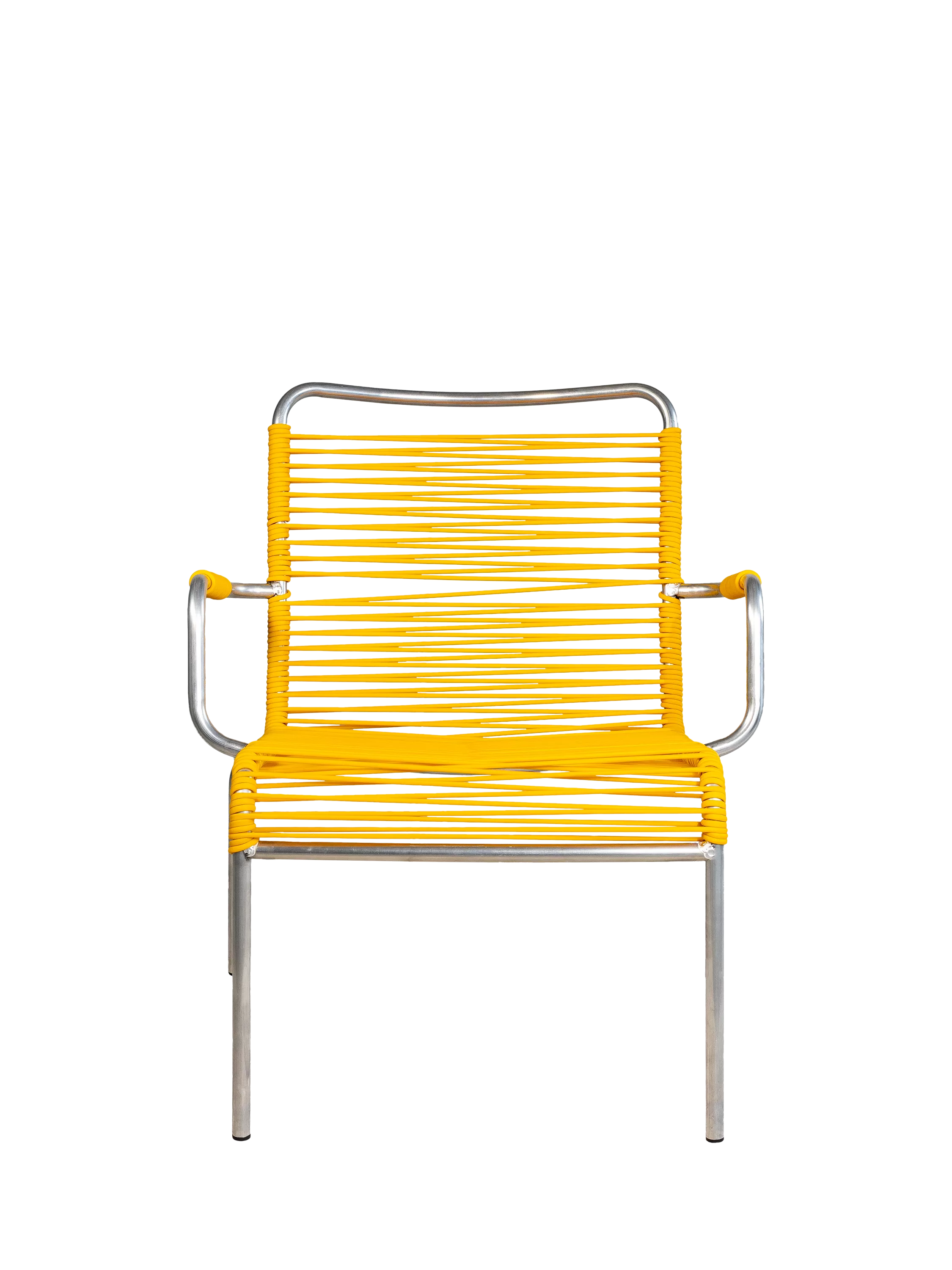 The Mya lounge chair with armrests recalls the rounded shapes of mid-century furniture with its striking design and spaghetti-style weaving. The look creates a relaxed and comfortable feel with the lightweight yet sturdy aluminium frame providing support.