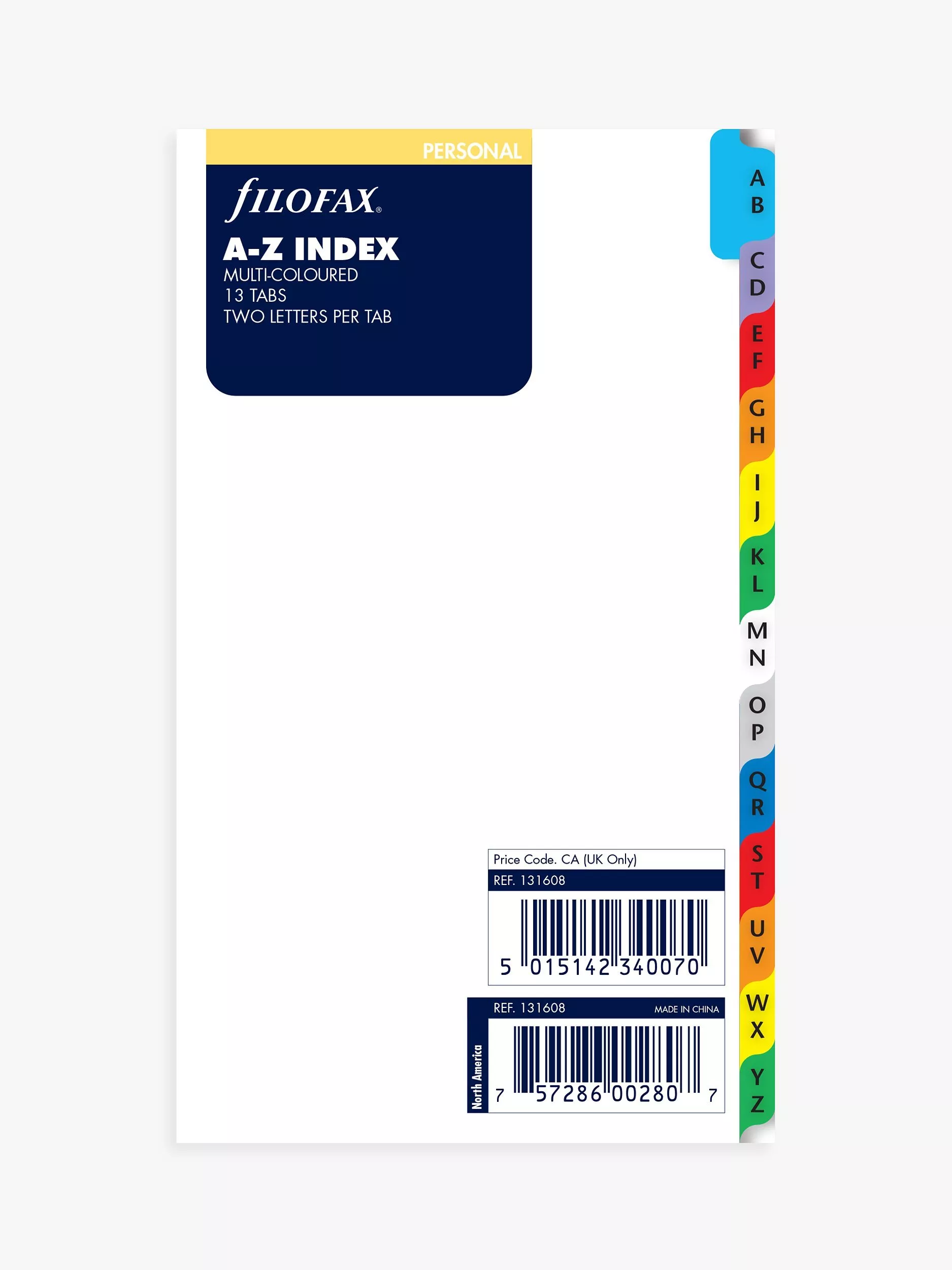 Keep track of your contacts with the Filofax Personal multicoloured A-Z tab dividers. Features two letters per tab. This index fits a Personal size organiser. Product size 171mm x 95mm.