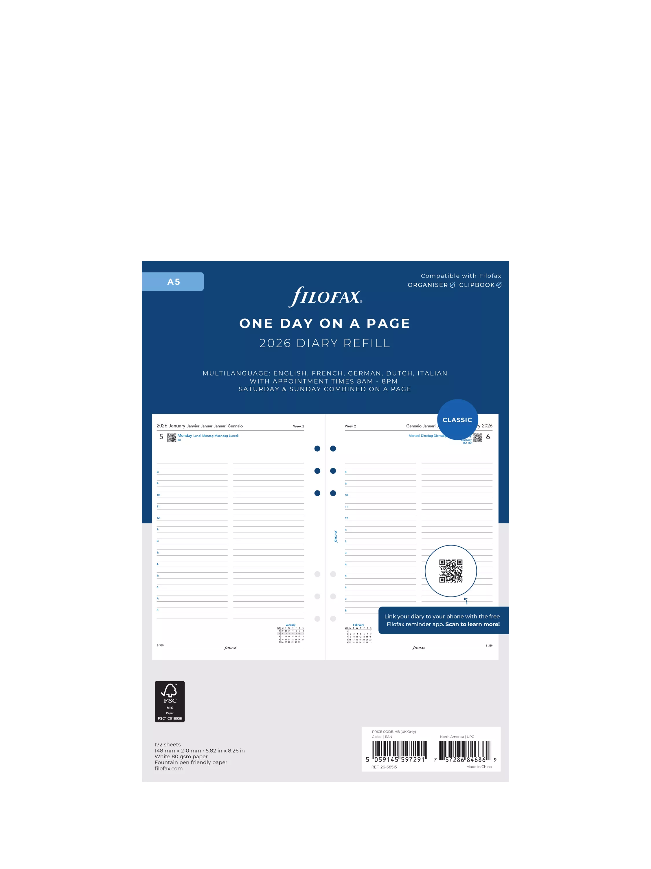 Organise your appointments with this A5 day per page diary. Saturday and Sunday are combined on one page. Multilanguage English, French, German, Dutch & Italian. 80gsm white fountain friendly paper. Compatible with Filofax A5 Organiser and Clipbook. Filofax Reminder App compatible