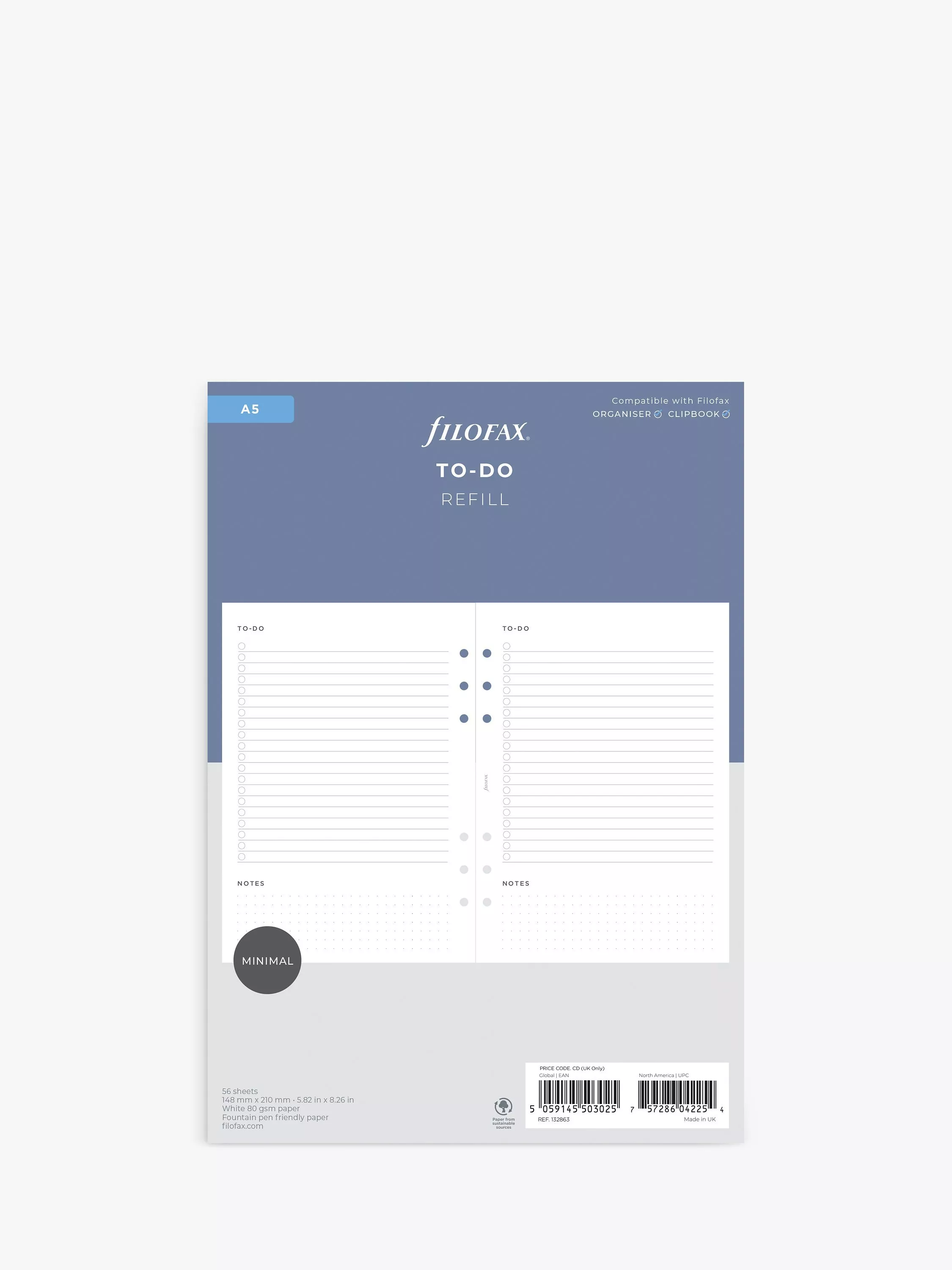 Stay on top of daily chores and errands with this fun To Do A5 organiser refill in Minimal style. Give your reminders a home with the handy note section, designed for making life that little bit easier. The pack contains 56 sheets of fountain pen friendly 80 gsm white paper. Compatible with A5 Filofax organisers or A5 Clipbook. Paper size 148mm x 210mm.