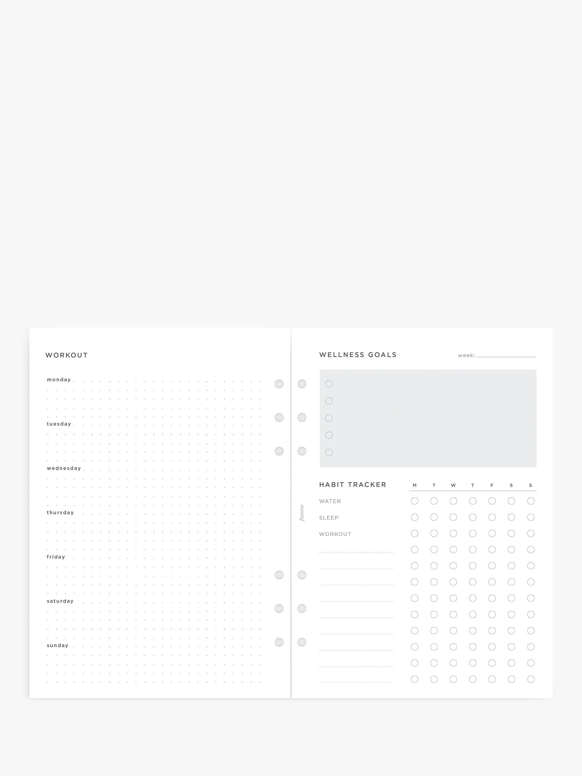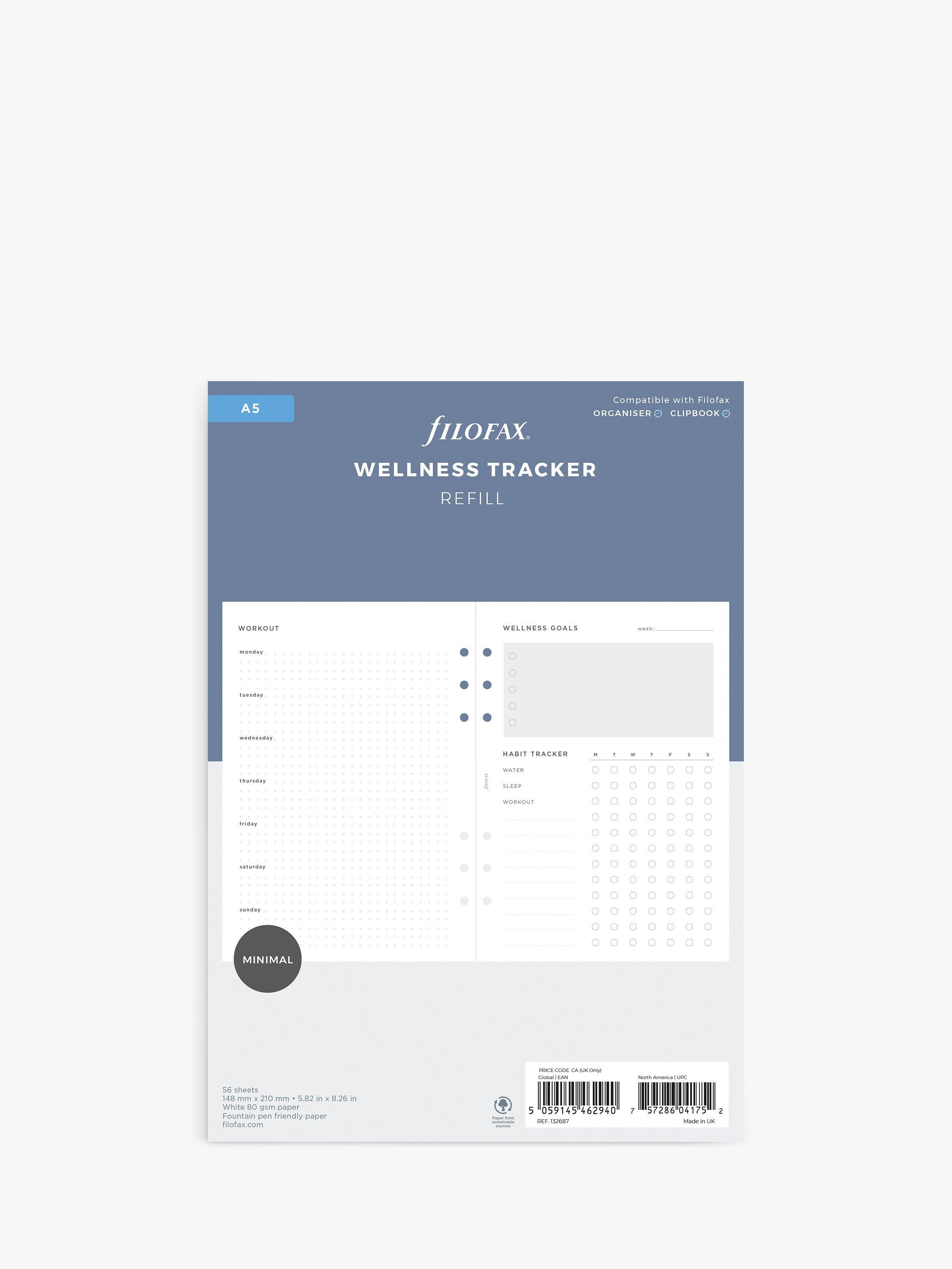 Look after your health with the stylish A5 Wellness refill. Featuring pages for exercise, goals and tracking habits. Compatible with your A5 size Filofax organiser or Clipbook. This refill pack has 56 sheets of white 80gsm paper. Not suitable for the Filofax refillable notebook.