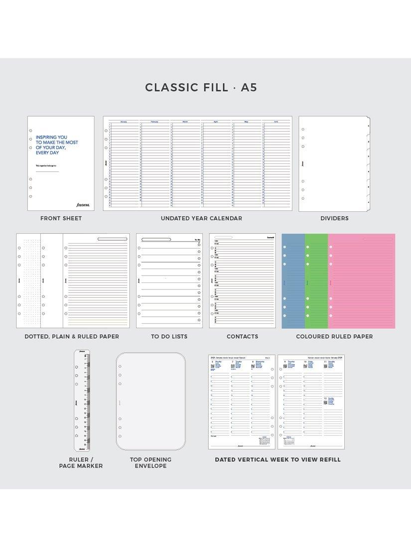 Includes: Paper flyleaf, front sheet, undated year planner, dividers blank, dotted paper, plain paper, ruled paper, to do lists, contacts, blue ruled paper, green ruled paper, pink ruled paper, transparent ruler / page marker, top opening envelope, dotted notepad (20 sheets). Please note contents may vary to those listed or shown in product images.