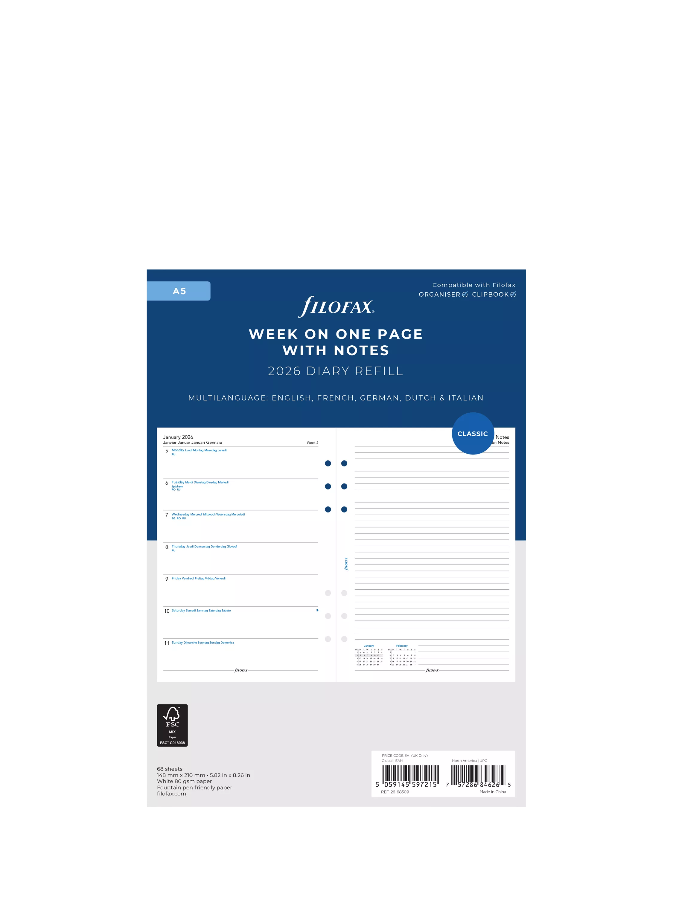 Organise your week in detail with this A5 week on one page diary with facing notes. Multilanguage: English, French, German, Dutch & Italian. 80gsm white fountain pen friendly paper. Compatible with Filofax A5 size Organisers & Clipbook.