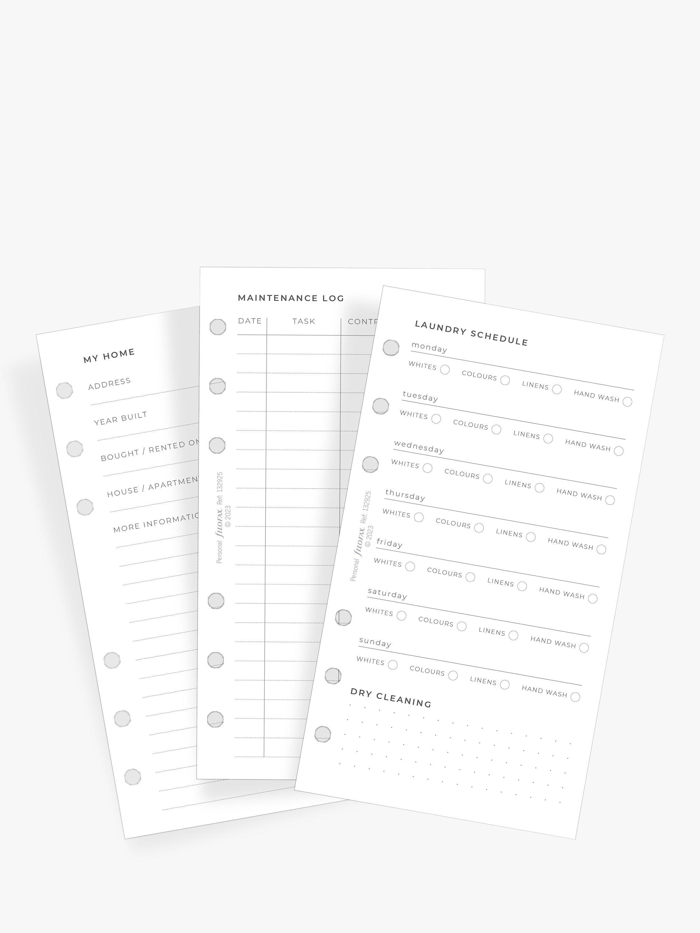 Always feel prepared for the week ahead with the Filofax household planner refill, featuring pages for weekly chores, cleaning trackers and laundry reminders. Never forget to take out the recycling again with the bin schedule. Also includes pages for maintenance log, utility bills, expenses, home repairs and key contacts. This handy essential is designed for your Personal size Filofax Organiser or Clipbook.
