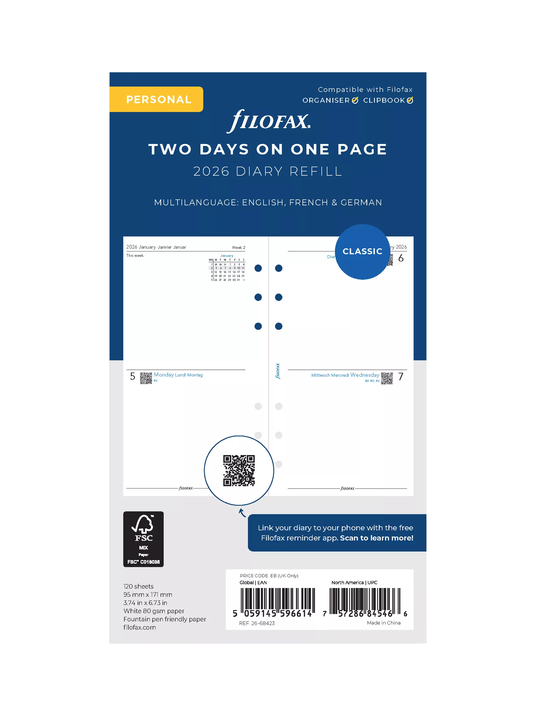 FilofaxPersonal Two Days per Page 2026 Personal Organiser Insert, White