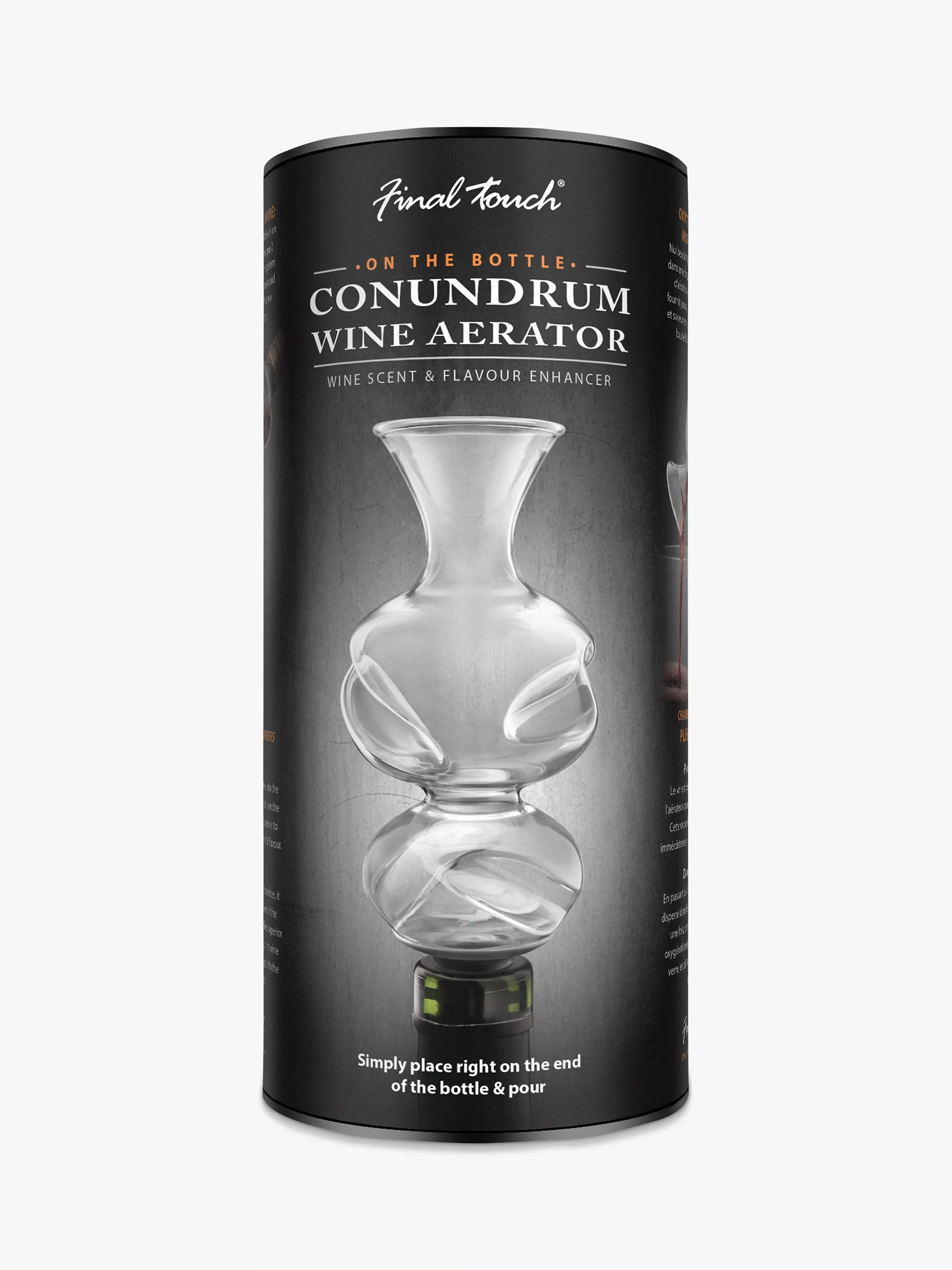 This first exposure to oxygen immediately increases scent and flavour. As the wine flows into the larger chamber, it travels over the curves of the aerator a second time which provides superior aeration and oxygenation. Finally the wine comes to rest in the glass bursting with the ideal flavour and bouquet. Packed in a smart gift tube.