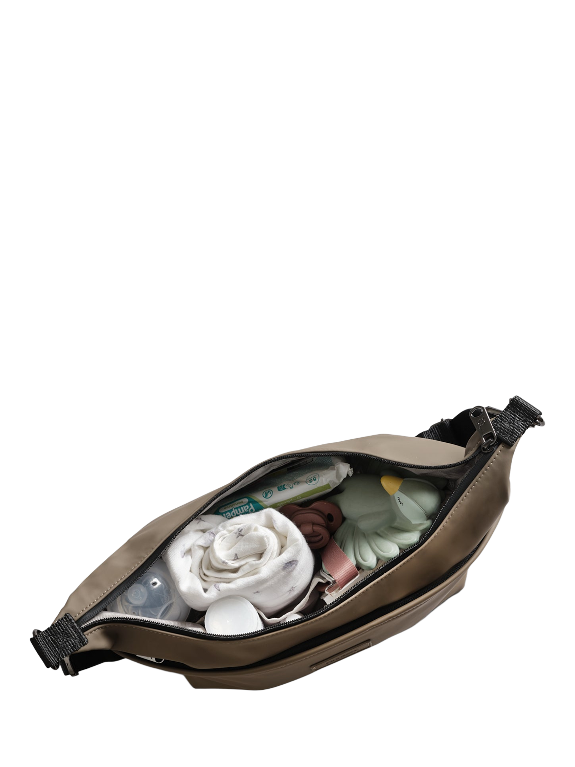 A sleek, compact pram organiser designed for modern parents. With an adjustable crossbody strap for hands-free convenience and universal and detachable Osten stroller clips for fast, secure attachment to your pram. Inside, a thermo bottle holder keeps bottles warm or cool, a light grey lining and multiple thoughtfully placed pockets ensure you can easily find nappies, bottles, phones, snacks, and more. A durable, water-repellent exterior that protects your essentials in all weather conditions. Use it as a mini changing bag or clip it directly onto your stroller to keep your baby essentials organised and within easy reach wherever your day takes you.