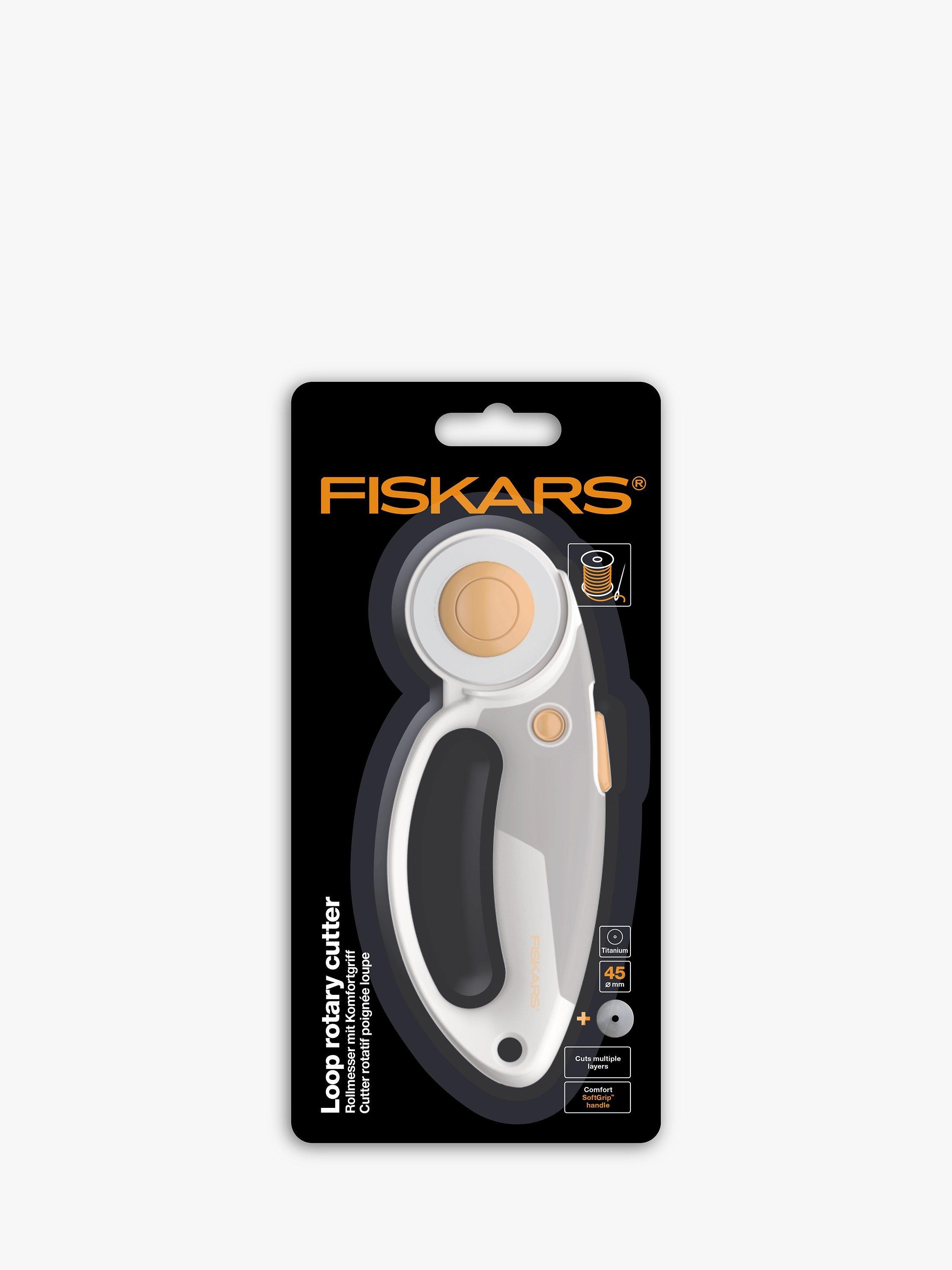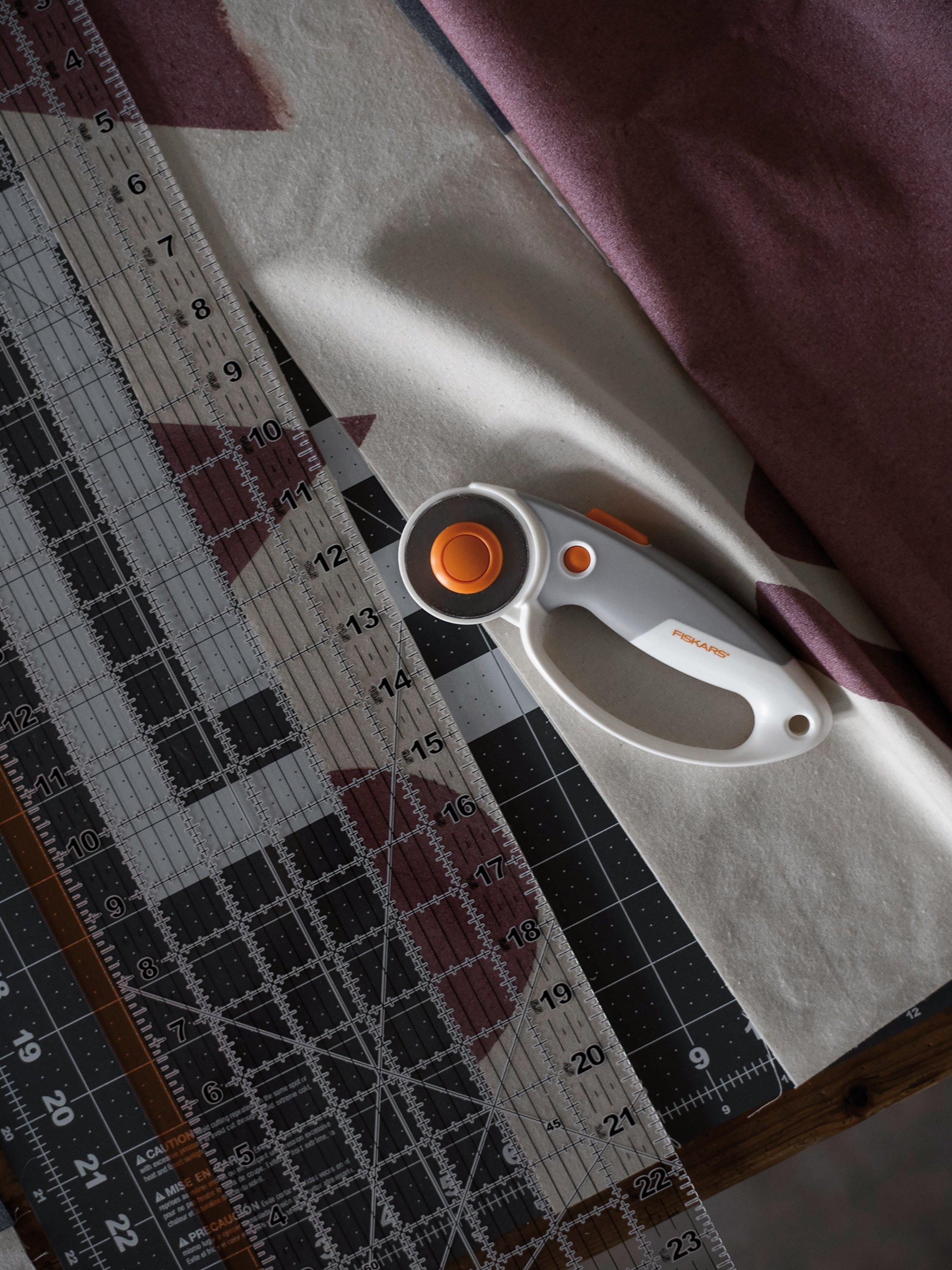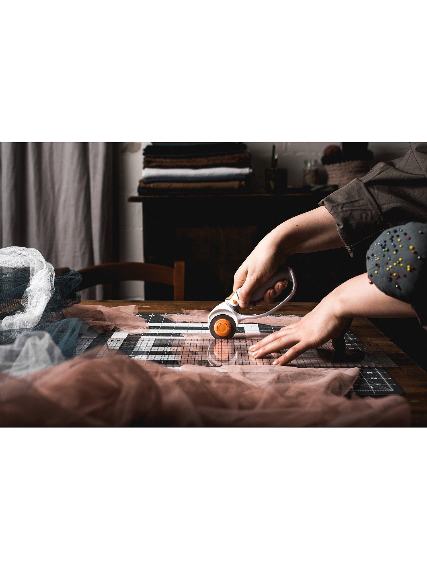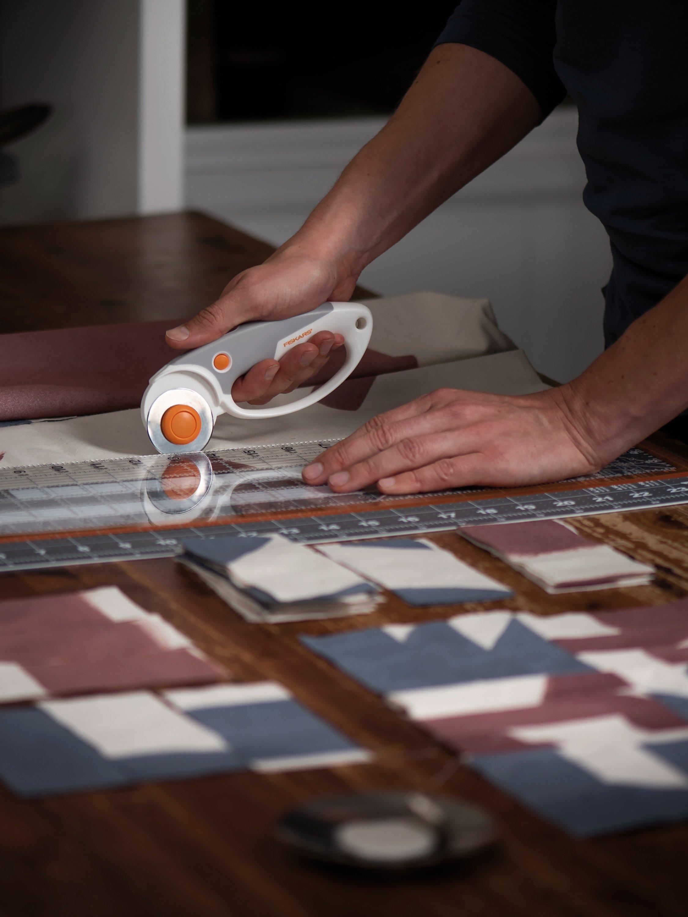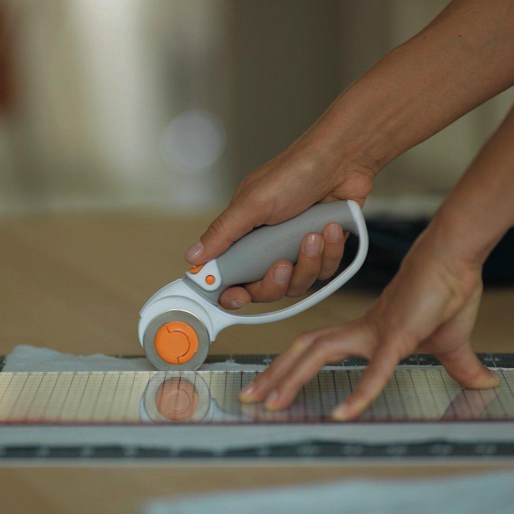 Easily and precisely cut through multiple layers of fabric with the Easy Blade Change rotary cutter from Fiskars.
