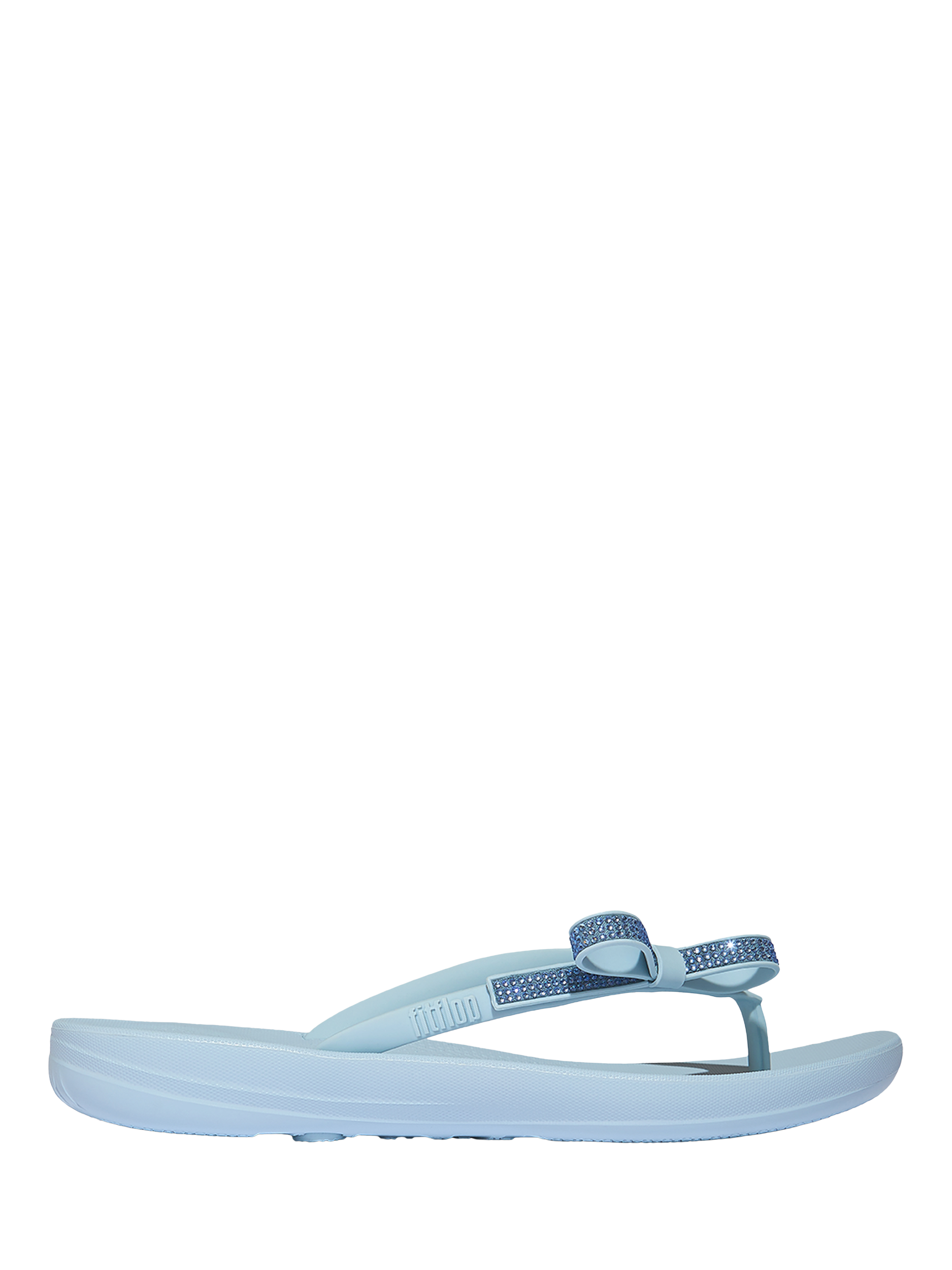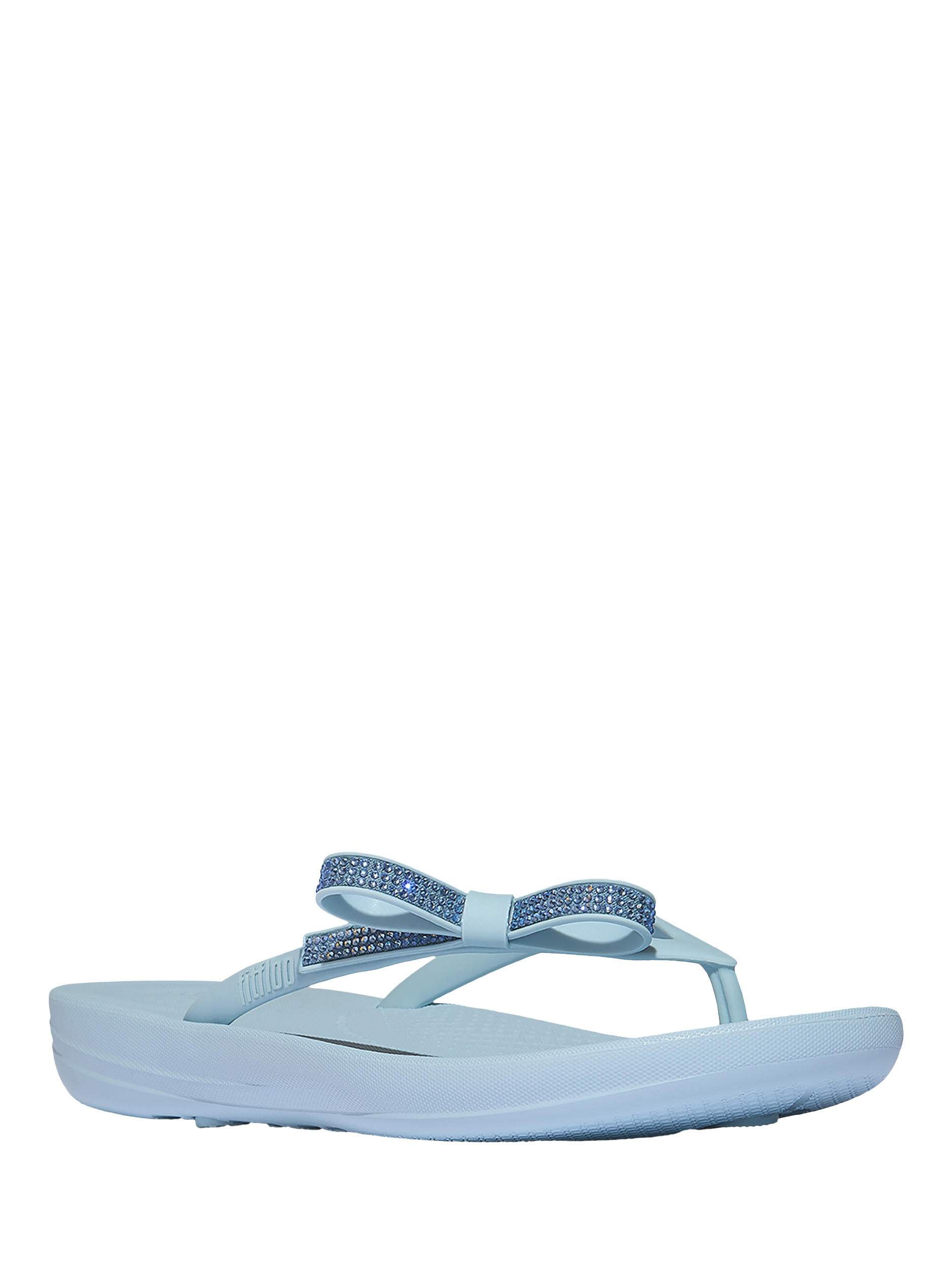 Comfort-engineered, beach flip-flops – this season adorned by a chic, sleek, crystal-smothered bow.