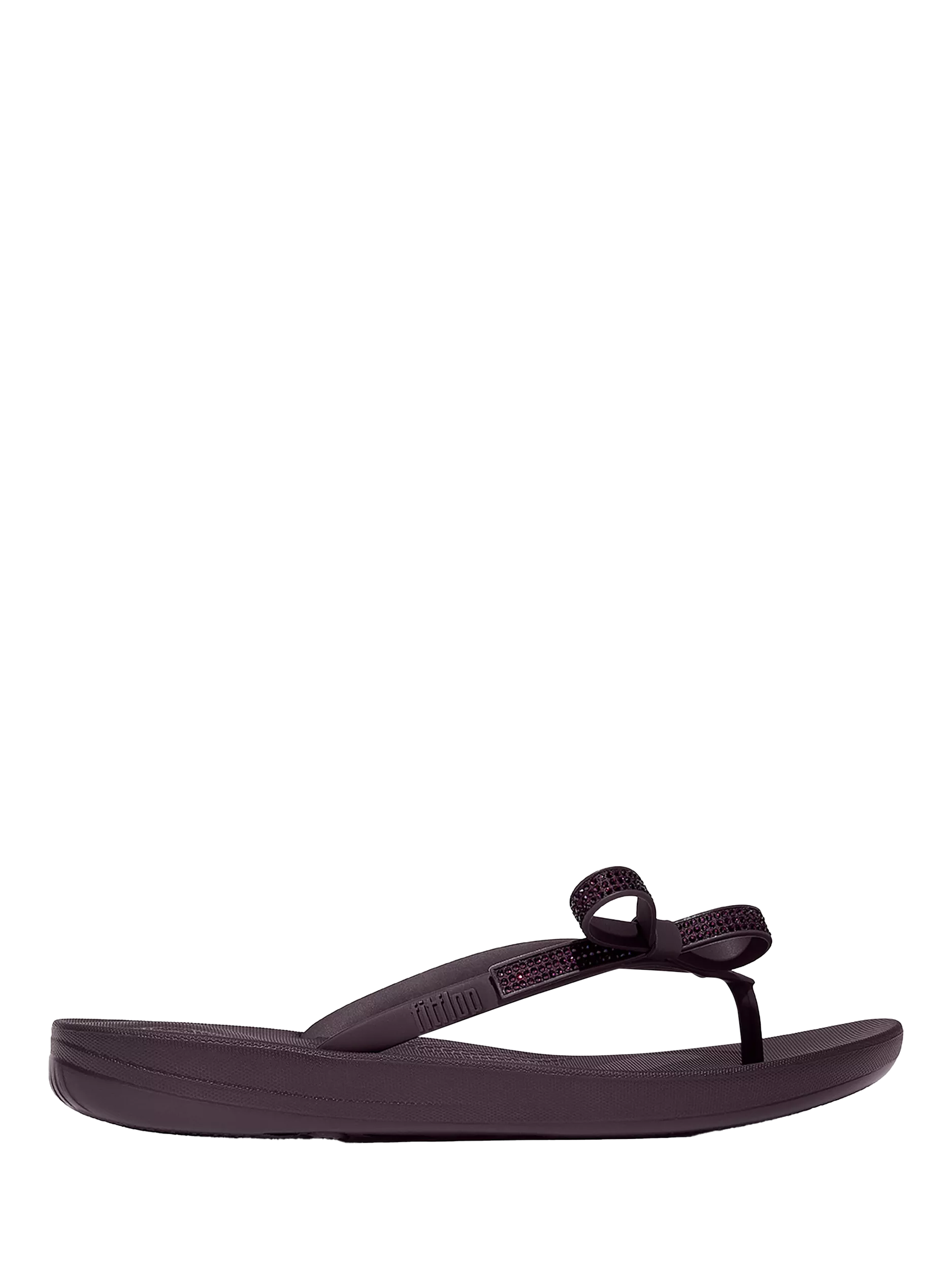Comfort-engineered, beach flip-flops – this season adorned by a chic, sleek, crystal-smothered bow.