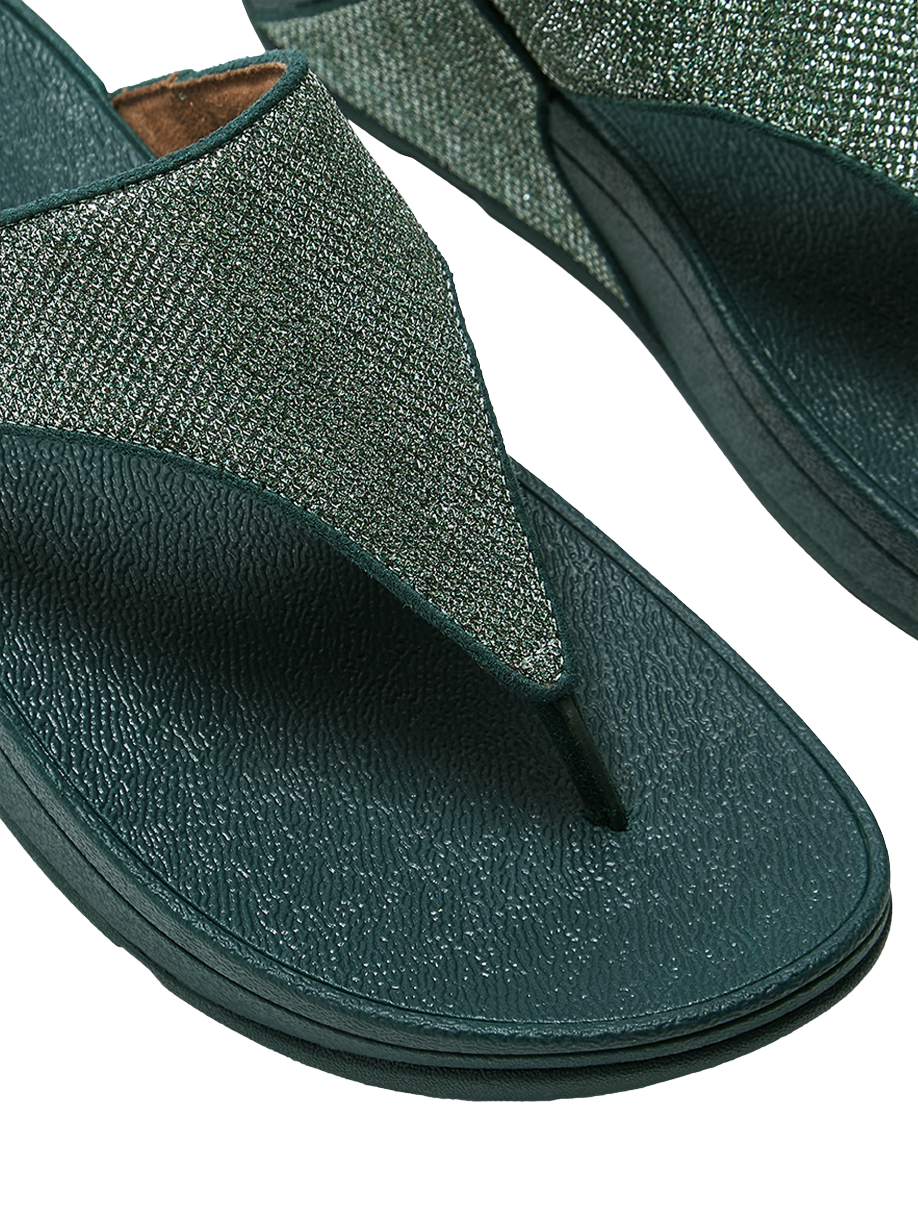 Sitting on a platform heel, they are structured with a toe post, making them easy to slip on and off.
