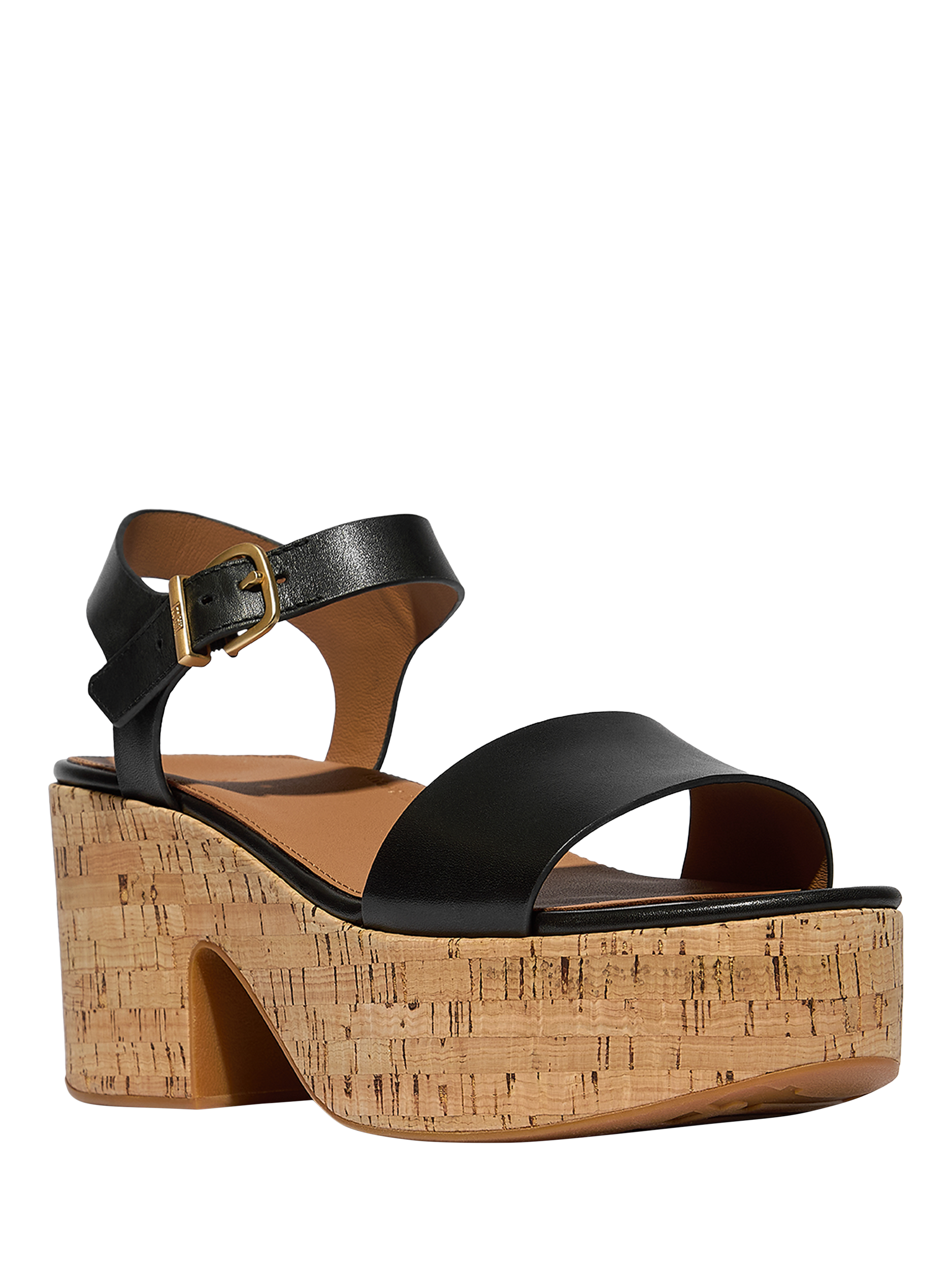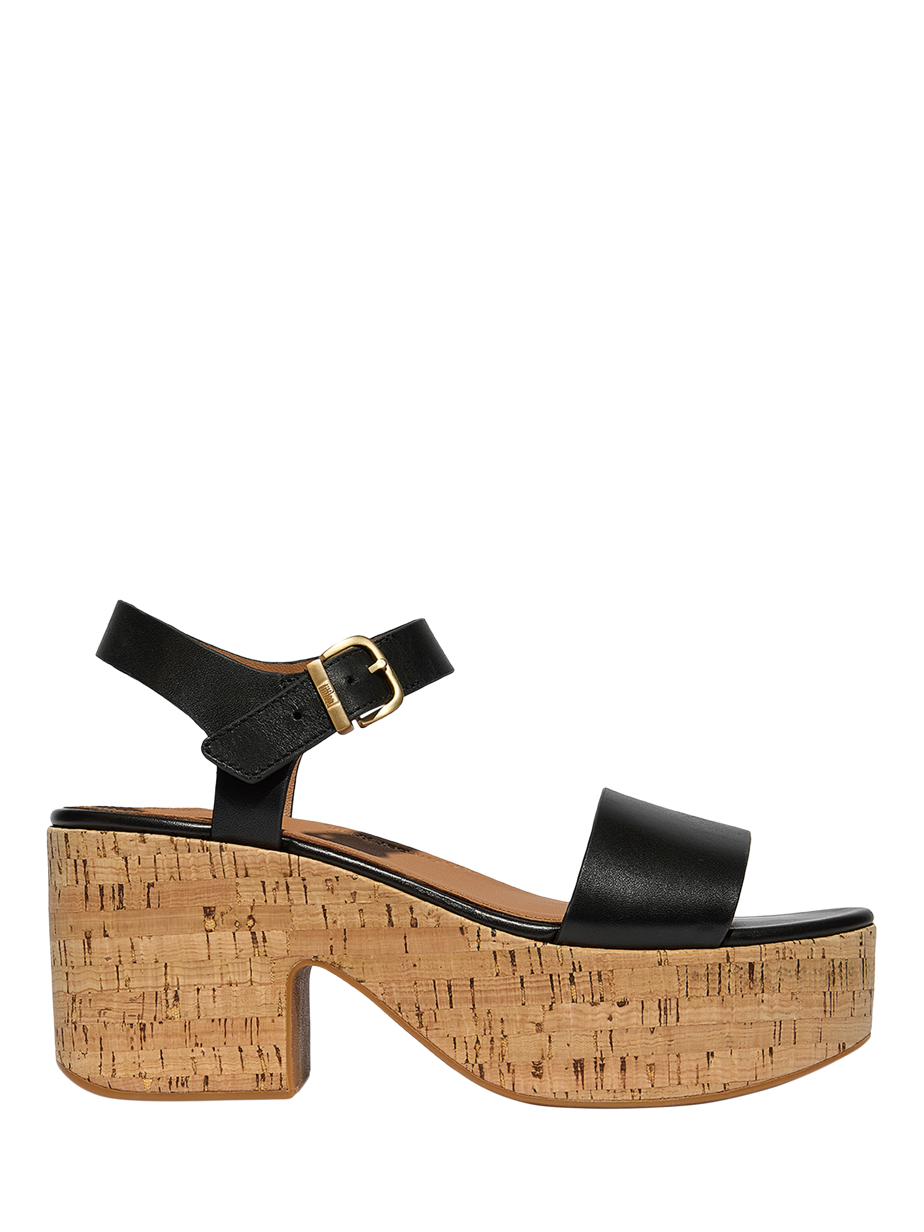 From the FitFlop PlatFForms range, these heeled sandals feature a leather upper with a leather footbed and an adjustable ankle strap buckle for the perfect fit every time. Completed with a comfortable cork heel.