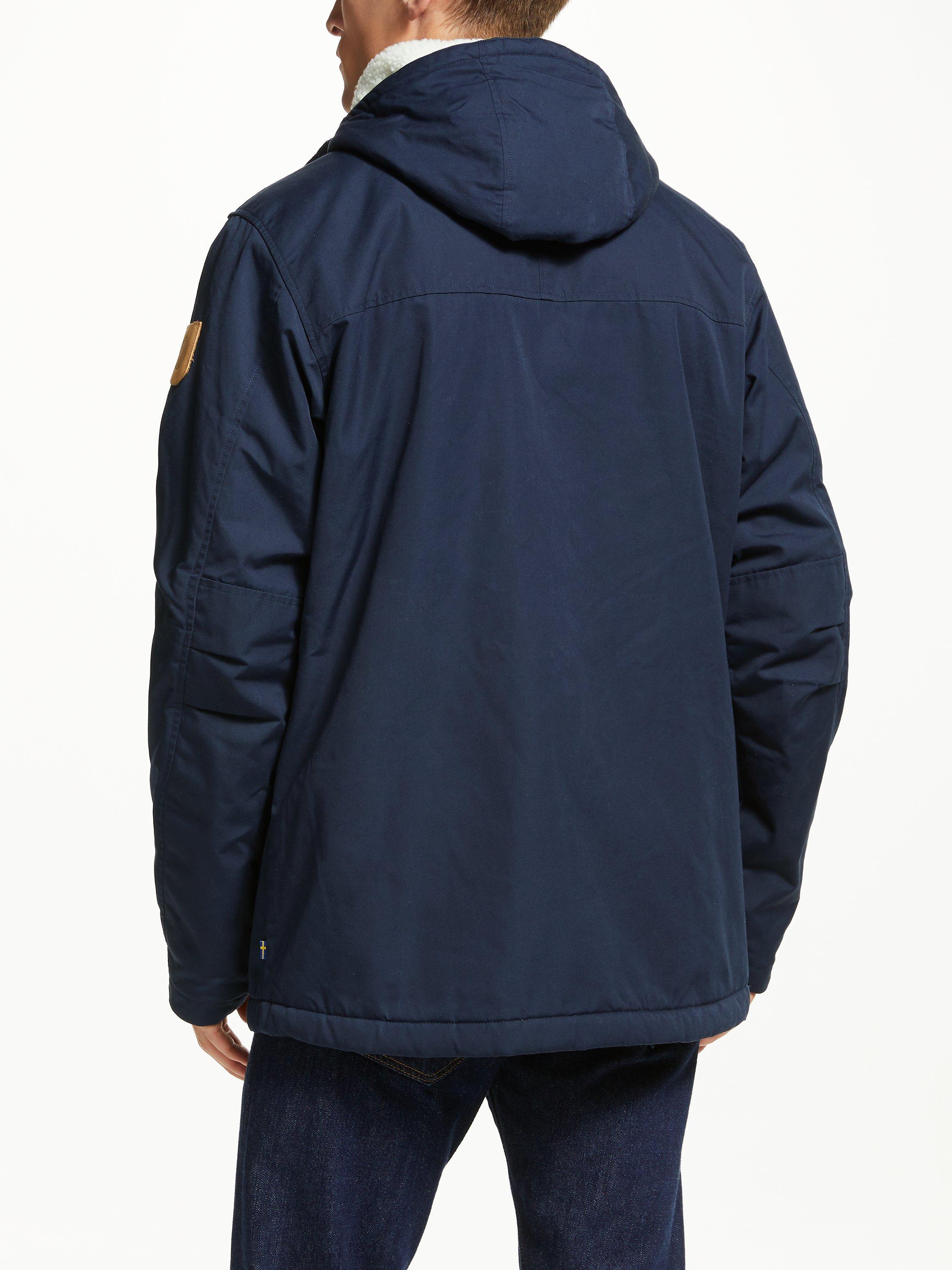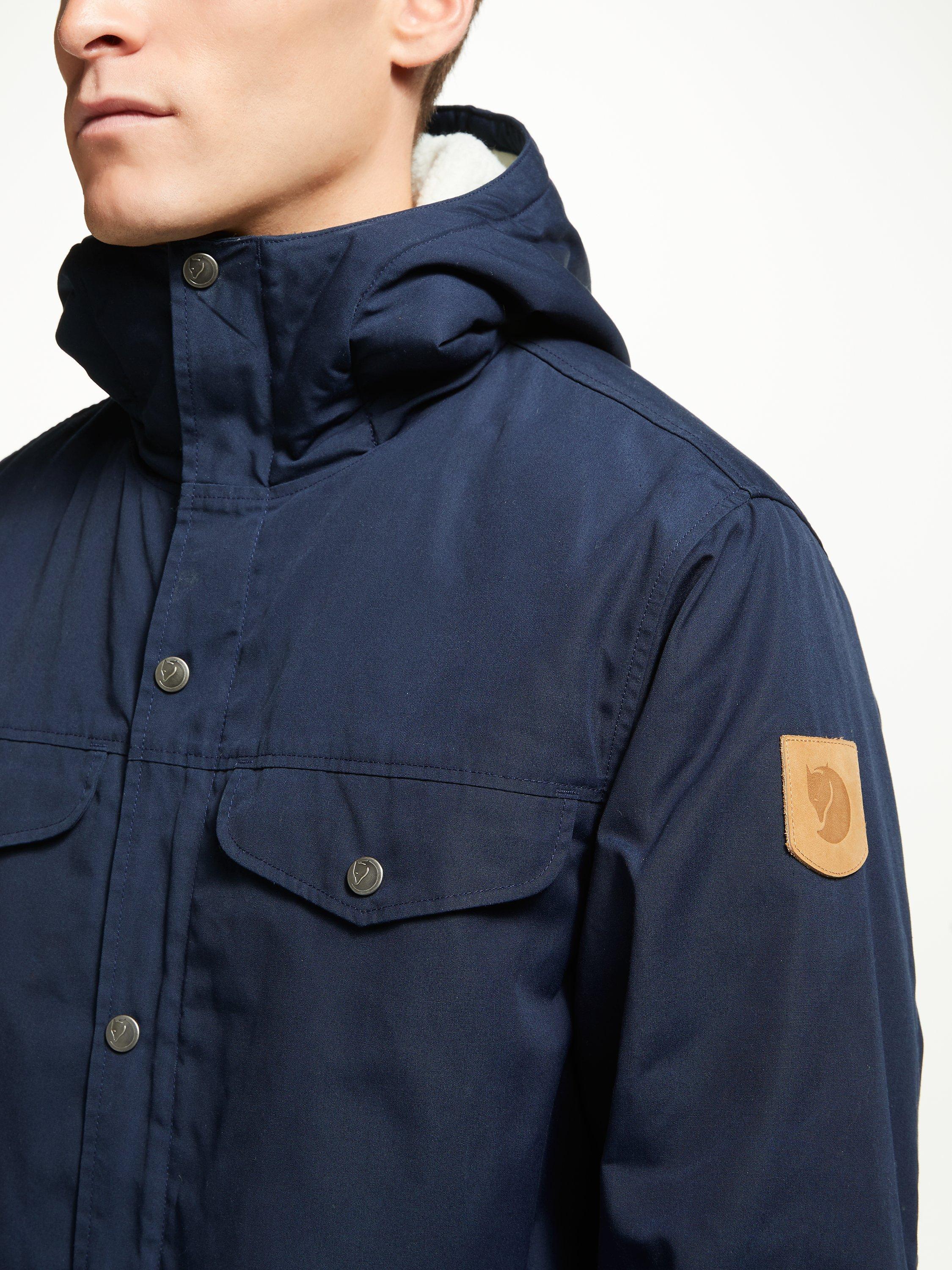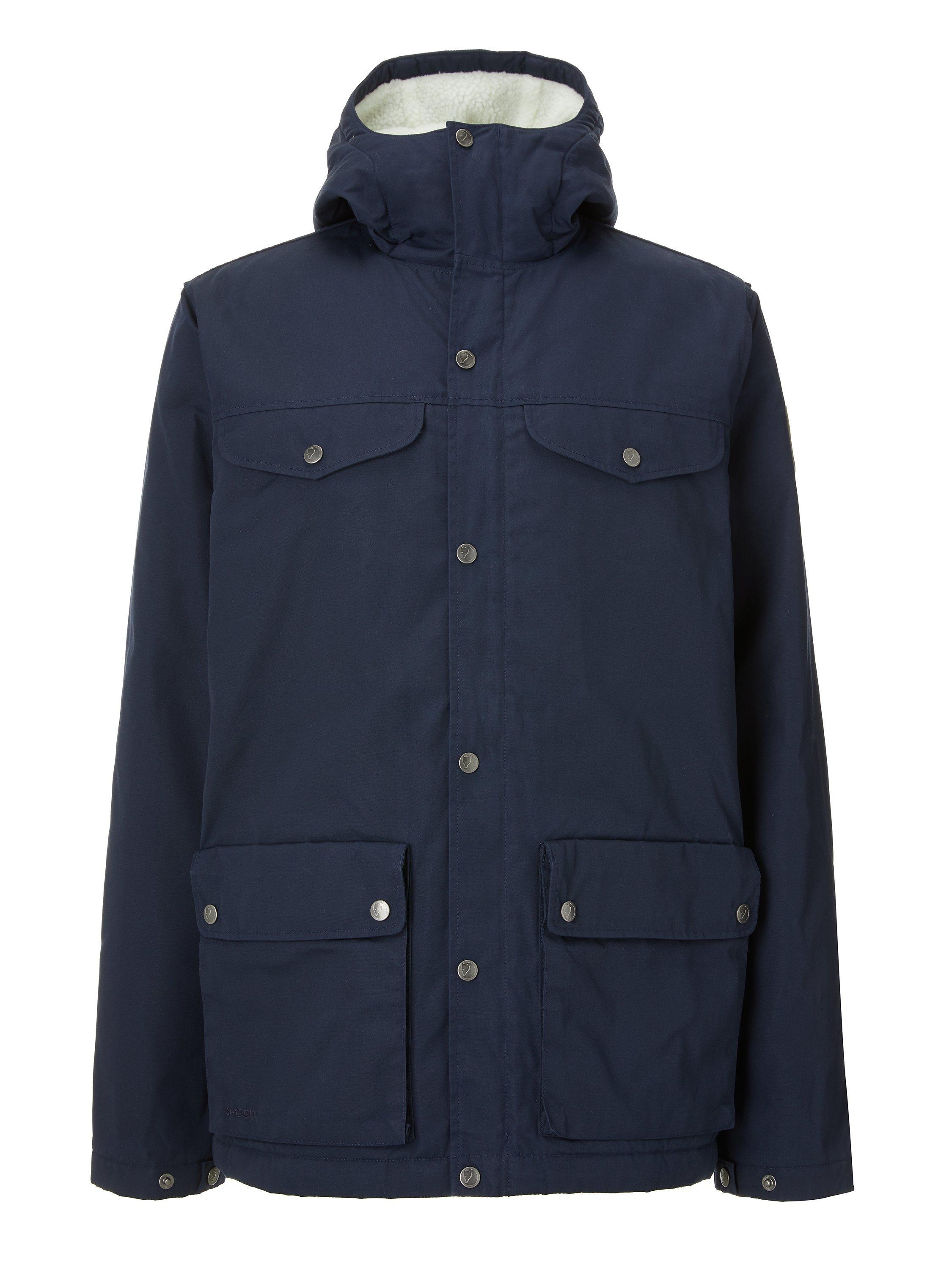 Keep warm as the weather cools with this Fjällräven Greenland jacket. This durable style features a fixed hood, two-way front zippers, a button protective flap, two chest pockets, two bellows pockets with buttoned flaps, an inside pocket and press button adjustments on the sleeve cuffs.