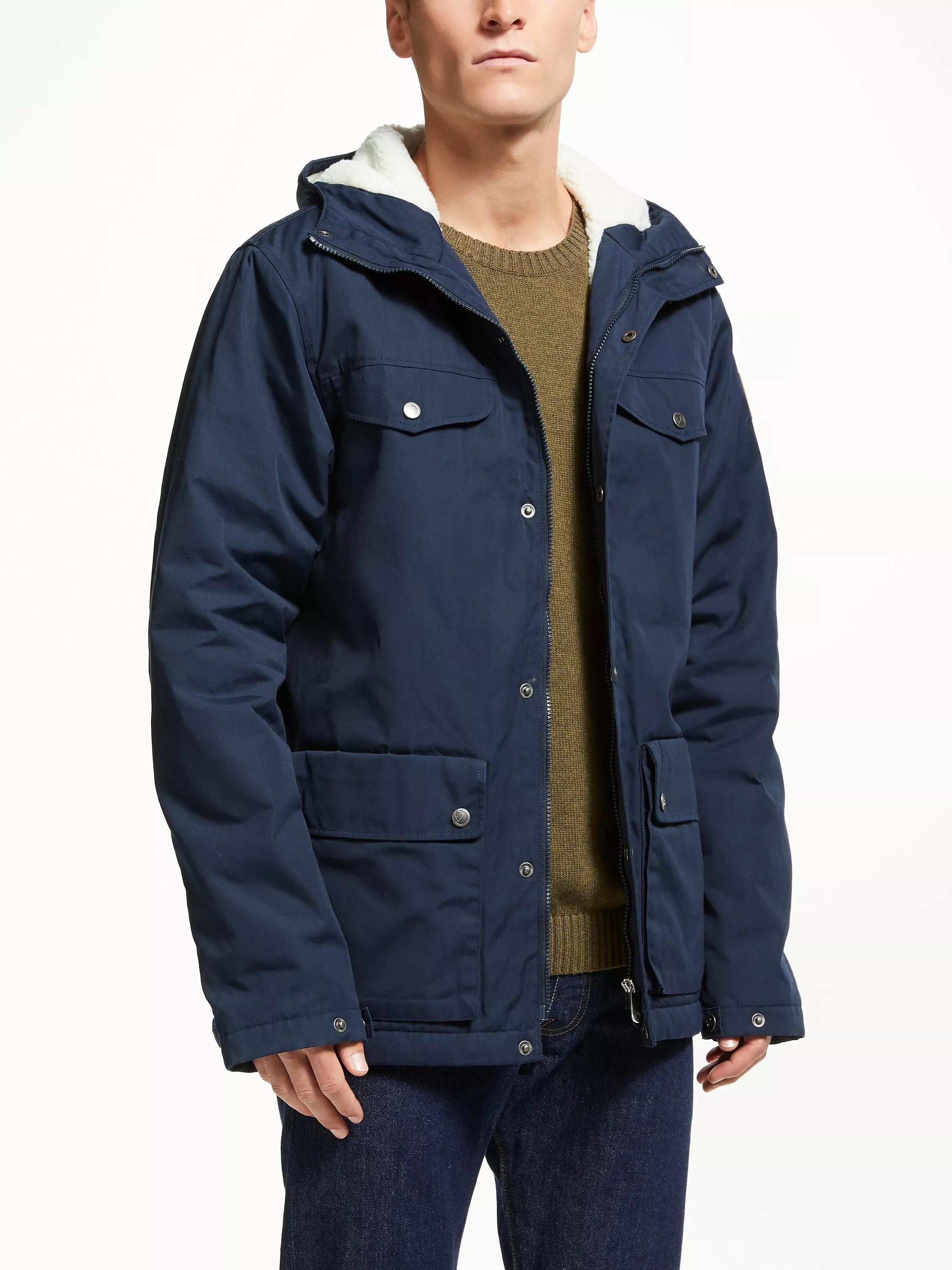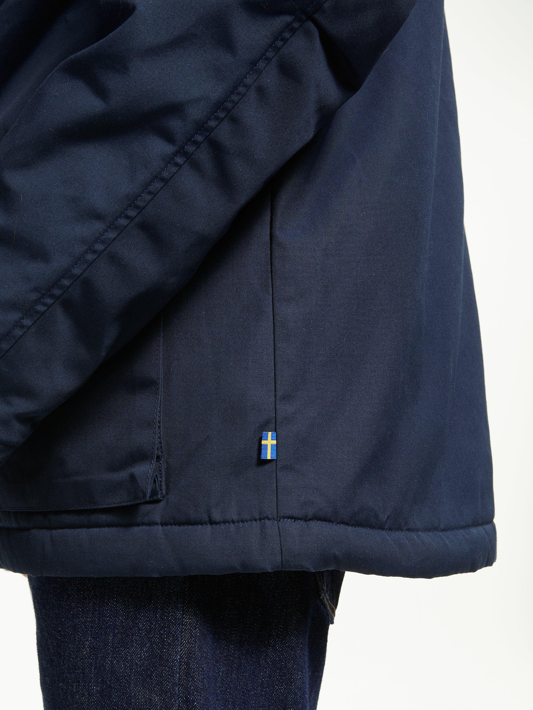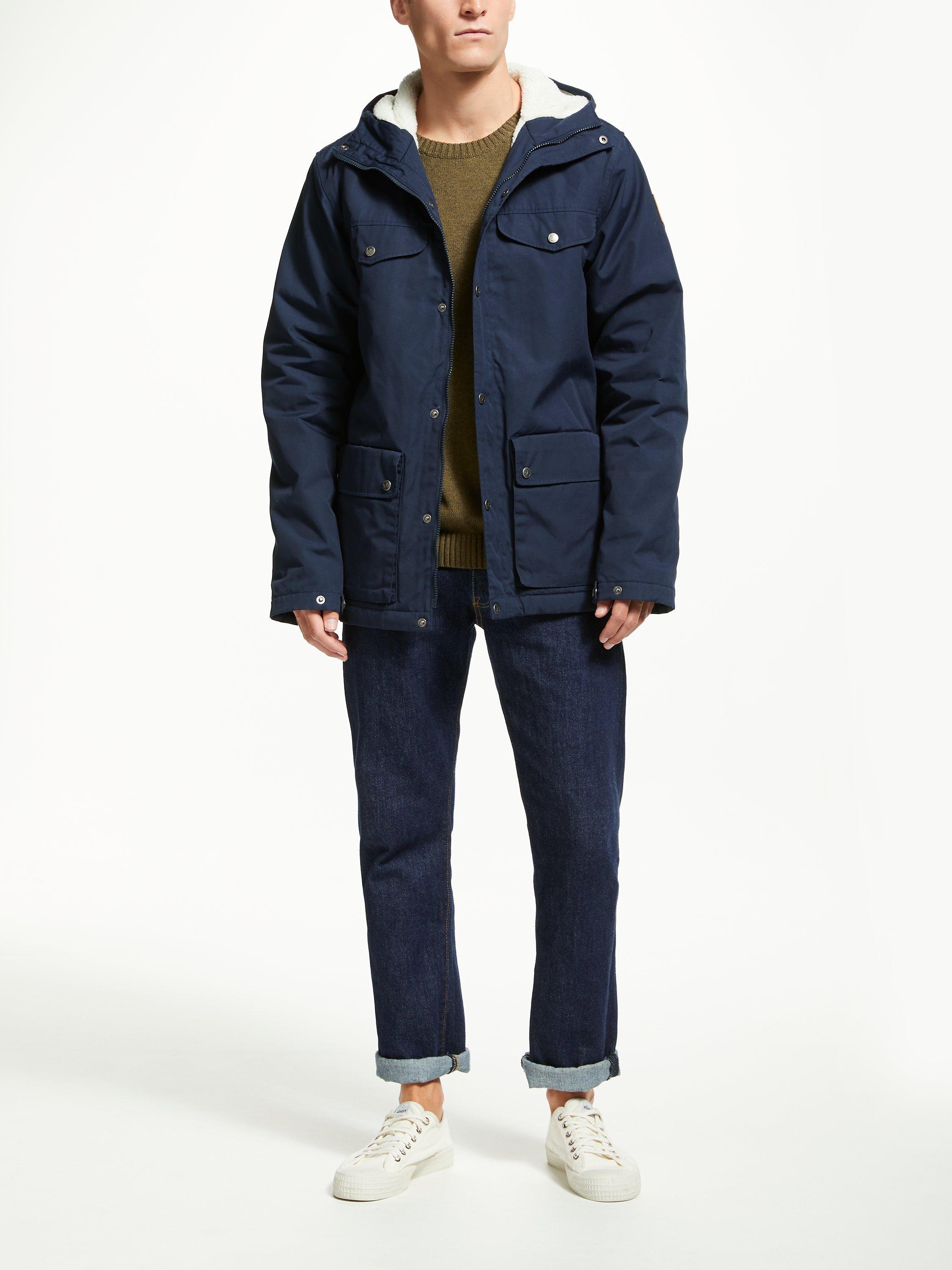 Keep warm as the weather cools with this Fjällräven Greenland jacket. This durable style features a fixed hood, two-way front zippers, a button protective flap, two chest pockets, two bellows pockets with buttoned flaps, an inside pocket and press button adjustments on the sleeve cuffs.