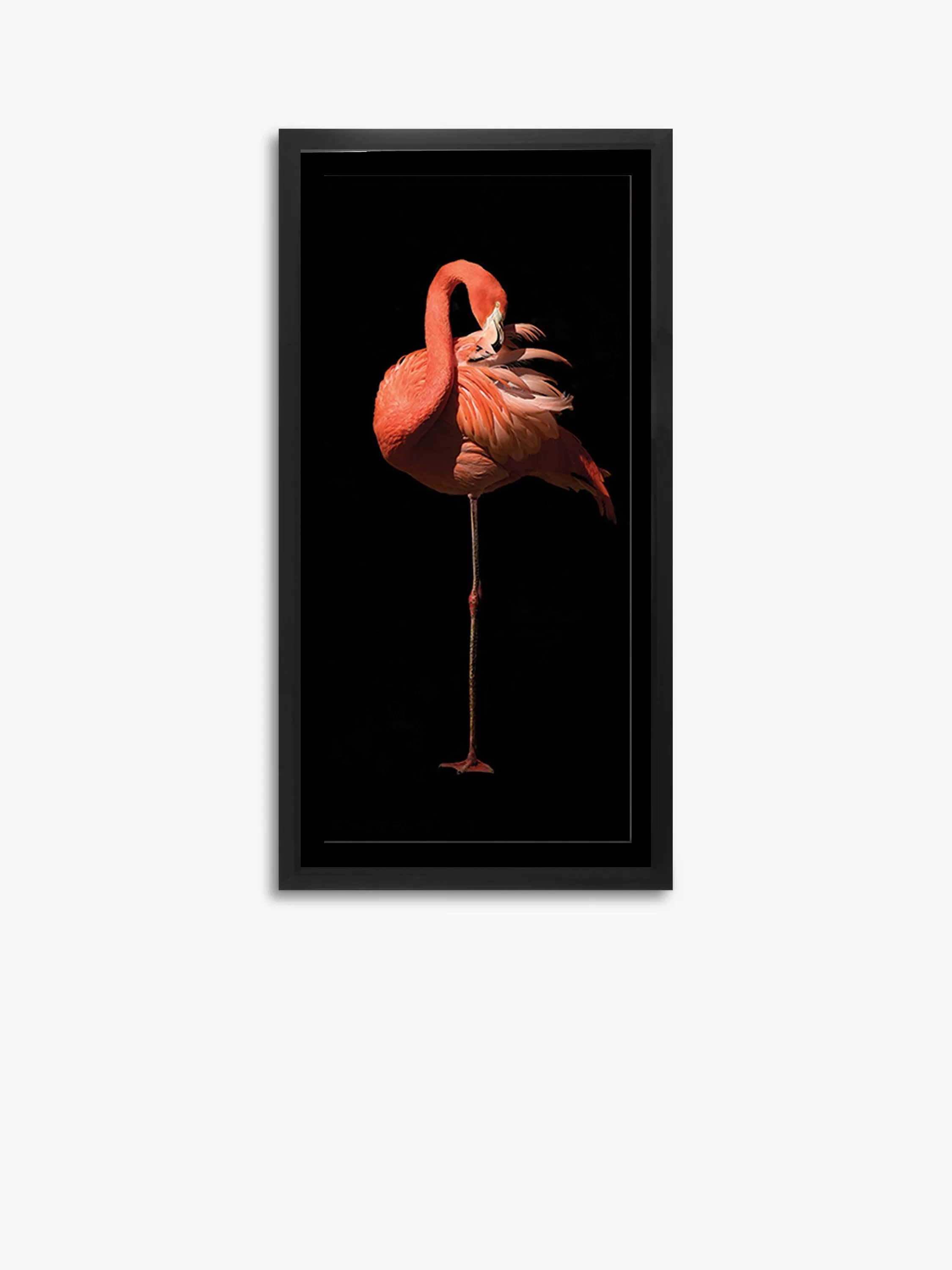 A detailed and colourful illustration of a flamingo, printed on satin photo paper and framed in a gloss black 'studio' frame. The frame is made of a recycled wood composite and comes with a matt black mount.