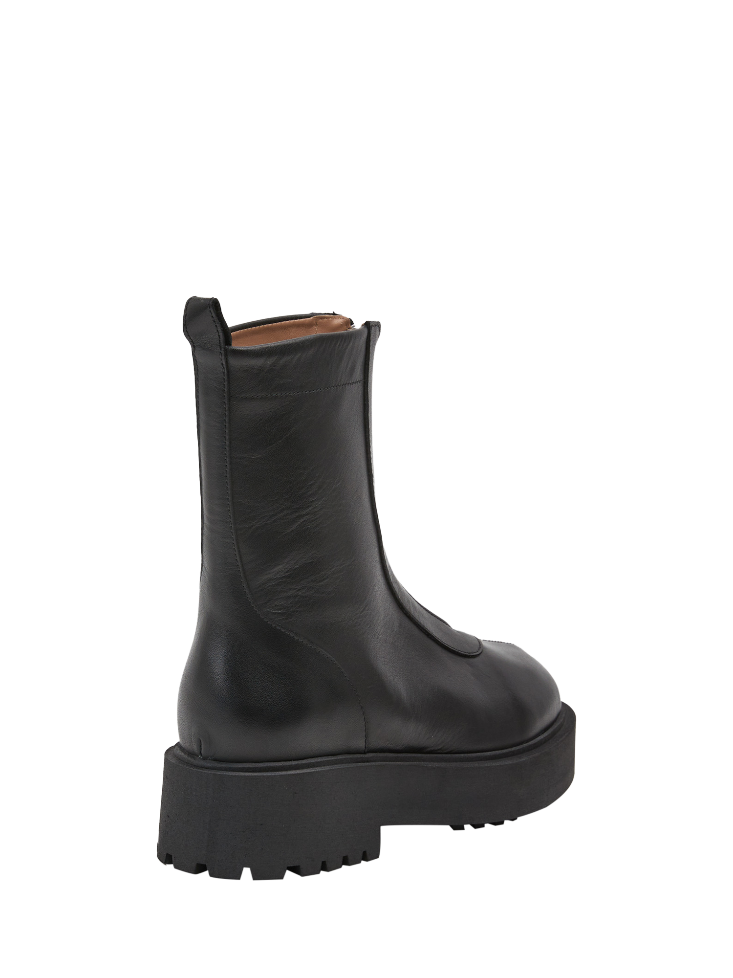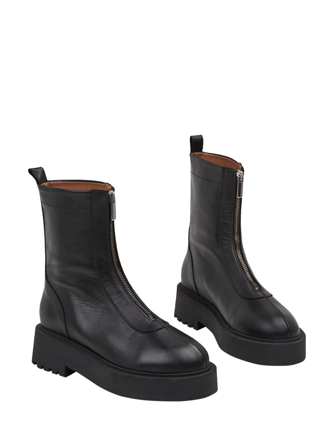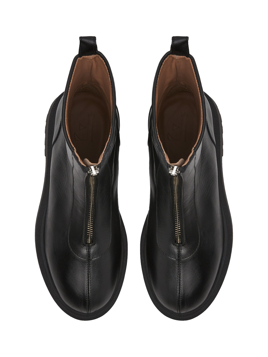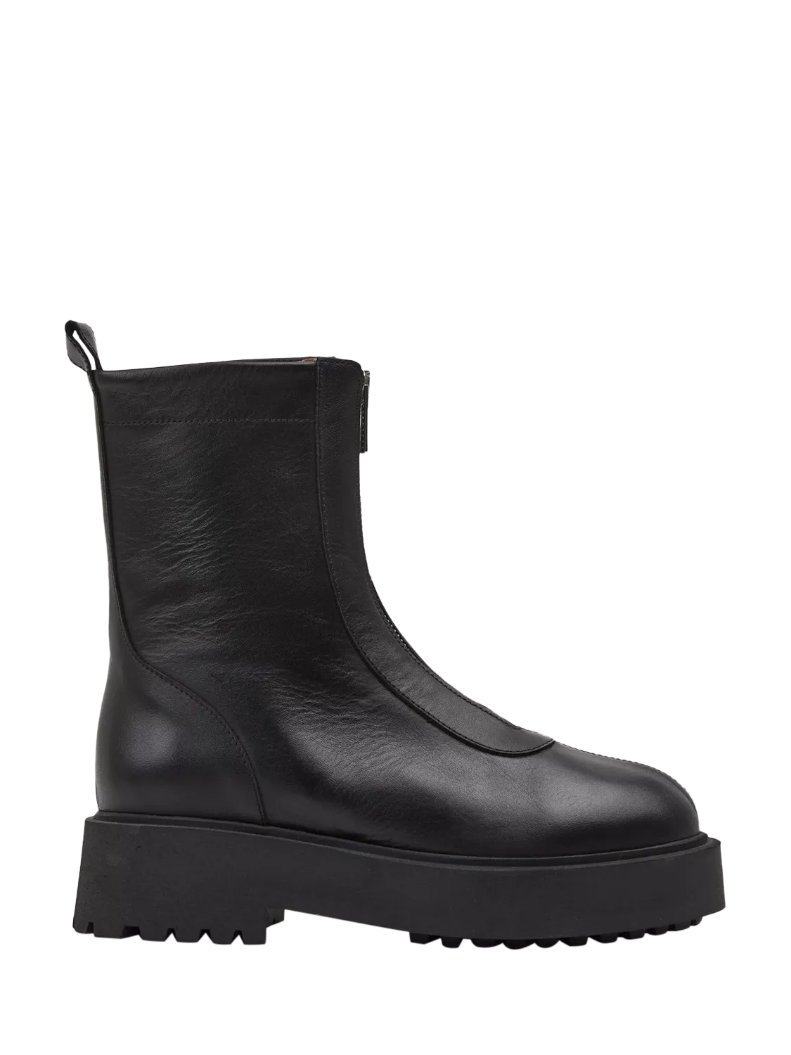 Alma from Flattered is an ankle boot made from smooth leather and featuring a front zip and a thick sole.